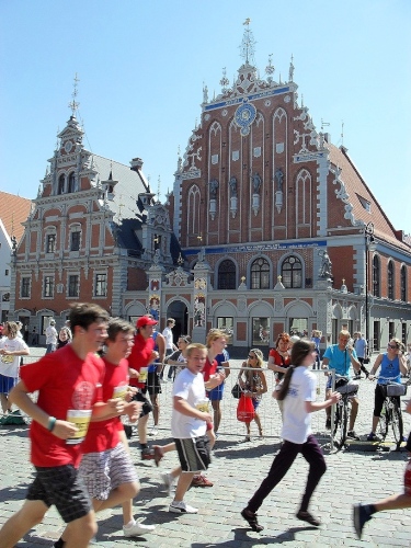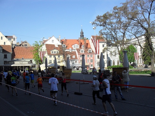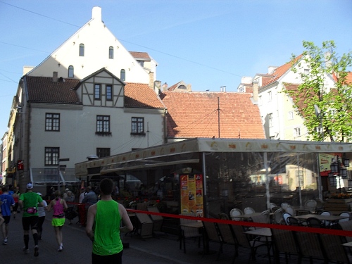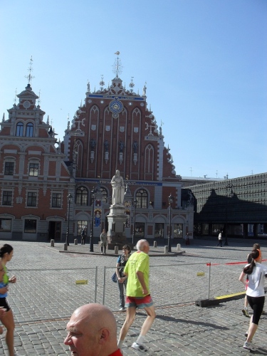 Bei purem Sonnenschein konnte man nun problemlos bis zum Fernsehturm im Süden schauen, der bei km 12 an der Strecke steht. Doch erstmal ging es von der Brücke hinab in die malerische Altstadt. Zu diesem Zeitpunkt war es hier noch sehr ruhig. Hier liefen wir natürlich über altes Kopfsteinpflaster. Vorbei ging es an der schon beschriebenen malerischen Kulisse der historischen Häuser am Livu Platz und dem Schwarzhäupterhaus zum Ufer der Dunä zurück, um uns dann gen Süden zu wenden.