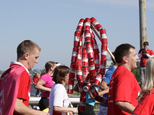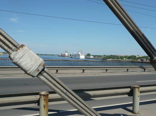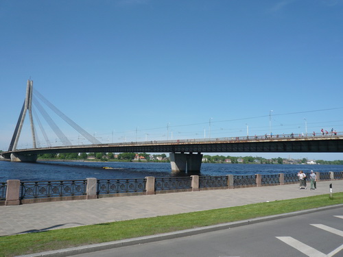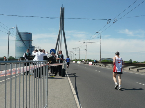 Bei km 8 ist ein Staffelwechsel, Musik und jetzt auch so richtig tolle Marathon-Stimmung mit vielen Zuschauern. Wir queren den Grüngürtel zur Altstadt, laufen über den Stadtkanal und sehen vor uns schon die markante Vansu-Brücke. Warum lieben alle Läufer Brücken? Wie euphorisiert rennen sie die Rampe hoch, angetrieben von Musik und vielen Zuschauern. Die gesamte Brücke ist für den Verkehr gesperrt, weil hin- und zurückgelaufen wird. Normalerweise nicht sehr prickelnd. Hier schon. Die Ausblicke auf den Hafen und die modernen Hochhäuser (Swedbank-Tower) am anderen Düna-Ufer und dann auf die Altstadt von Riga, das Schloss, die Steinbrücke, die Insel Zaķusala mit dem 368 Meter hohen Fernsehturm, ist etwas ganz Besonderes. Ich komme jedenfalls kaum vorwärts, so viele Bilder muss ich machen.