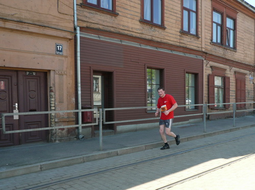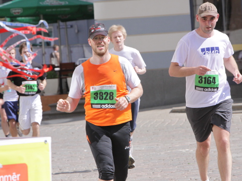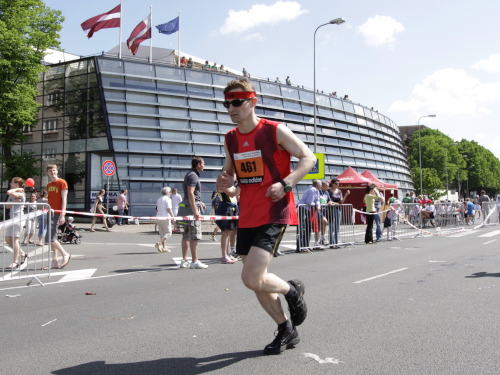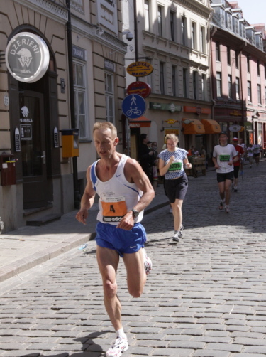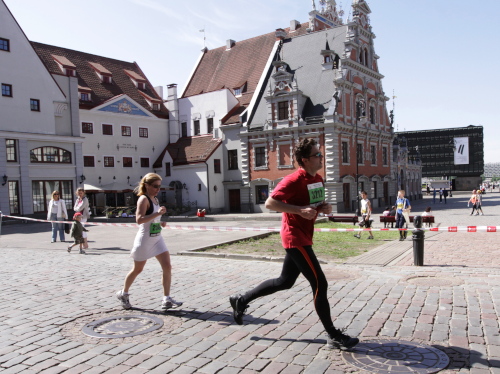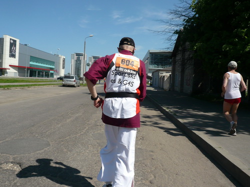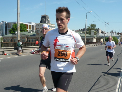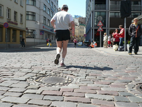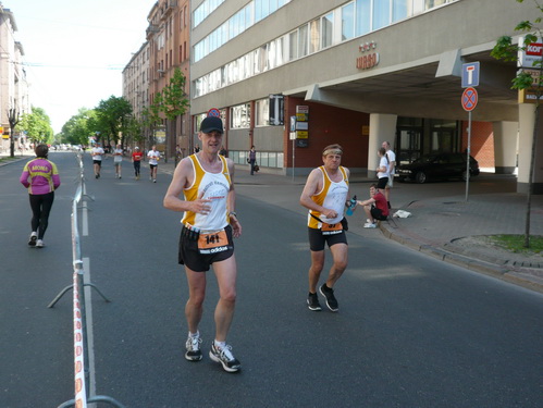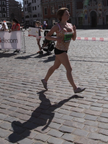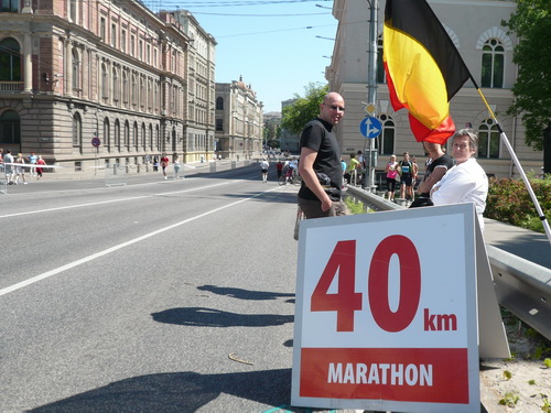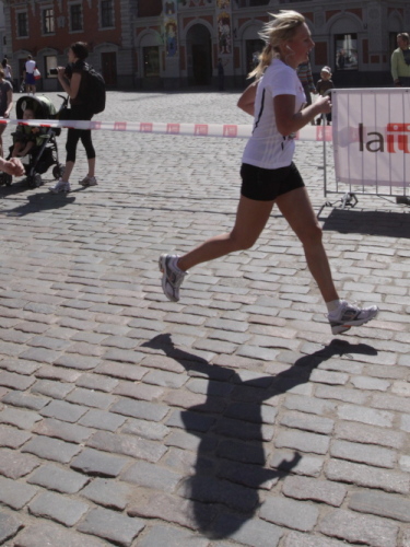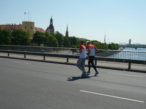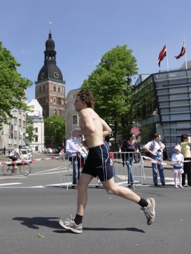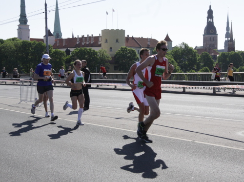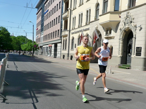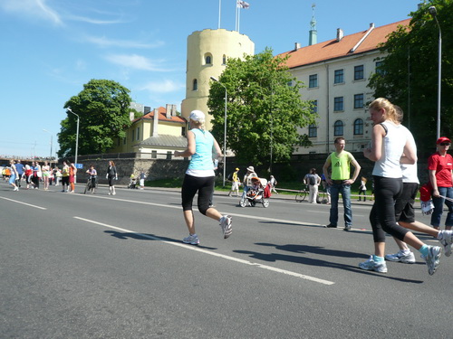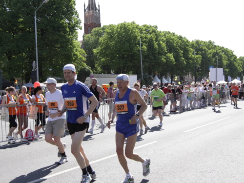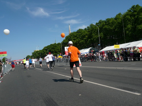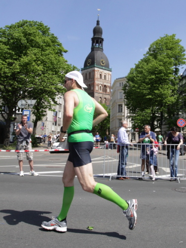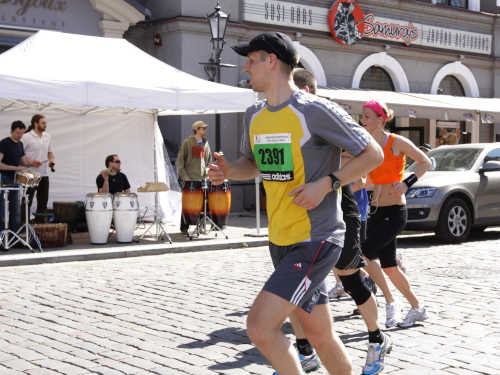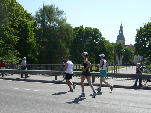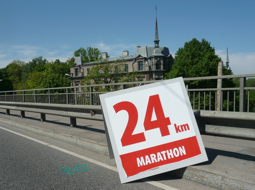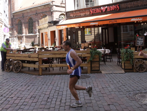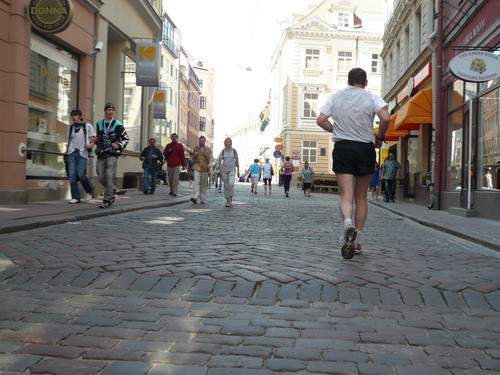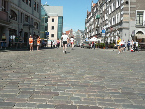 Ich mache mir so meine Gedanken, warum man sich wohl für 3 x 14 km entschieden hat und warum man nicht mehr durch die Altstadt läuft. Die Antwort ist einfach. Je weiter man in die Außenbezirke kommt, je unattraktiver wird die Strecke. Und um so durch die Altstadt zu laufen, wie wir das heute tun, müssen Bauarbeiter etliche Straßensperren entfernen und später wieder einbauen, was ein erheblicher Aufwand ist. Außerdem sind viele Gassen einfach zu eng, um Läufer und Begleitfahrzeuge aufzunehmen. Kurz, mehr Altstadt geht nicht und so gesehen haben die Organisatoren mit der jetzigen Strecke eine sehr gute Lösung gefunden. Nur wer von Riga lediglich die Marathonstrecke kennenlernt, schneidet nicht gut ab. Aber das ist immer so, in jeder Stadt.