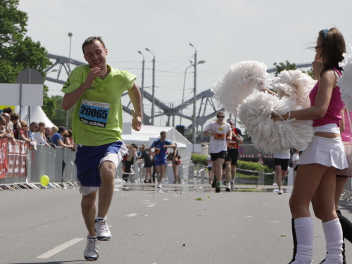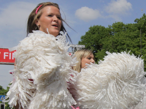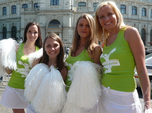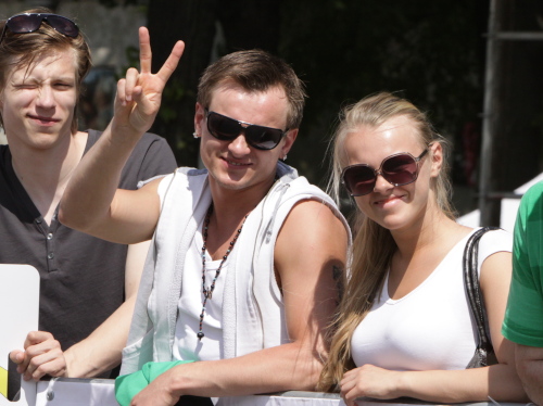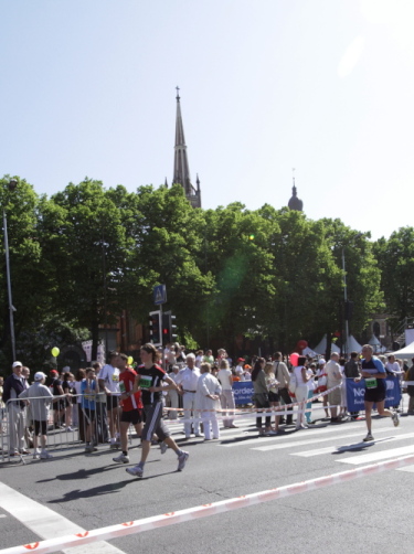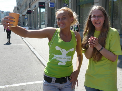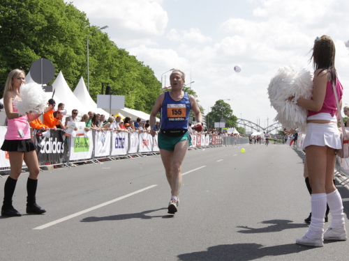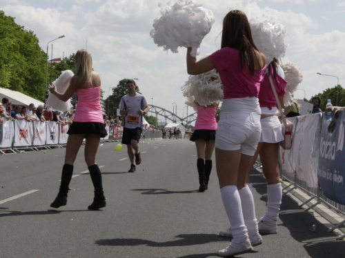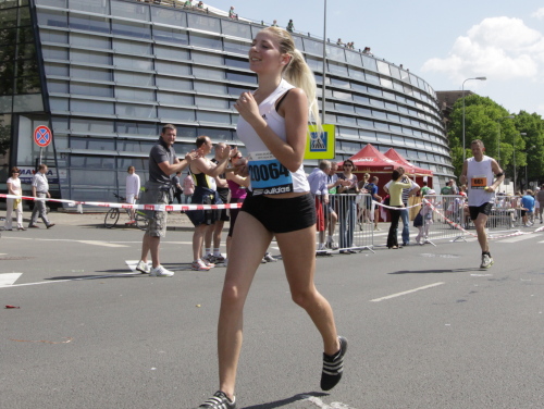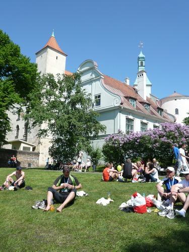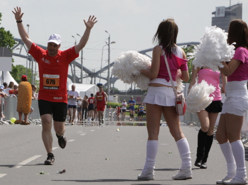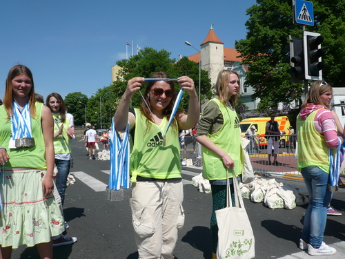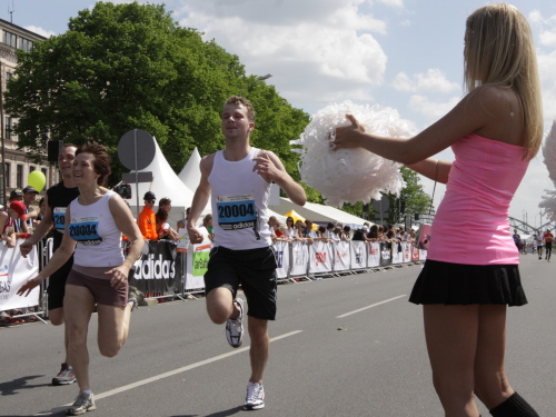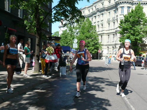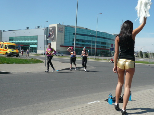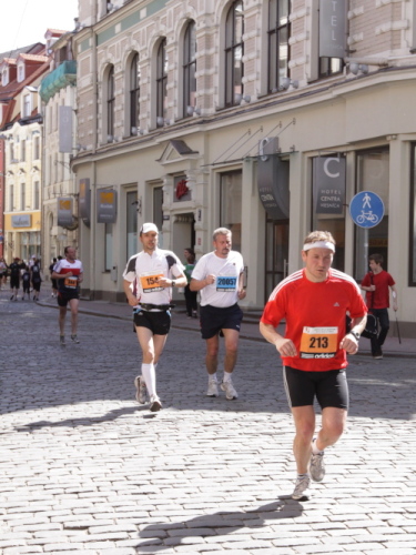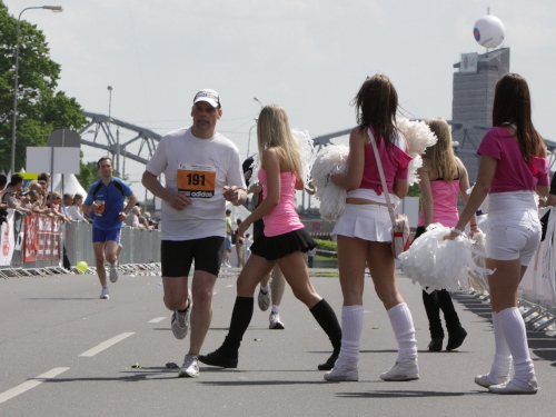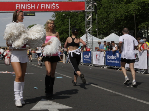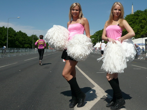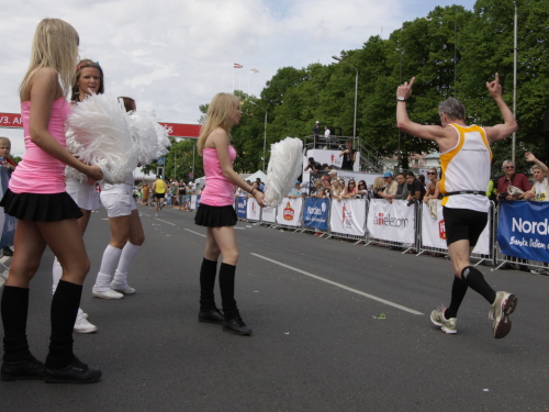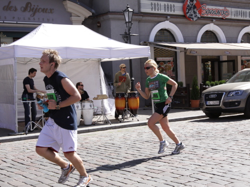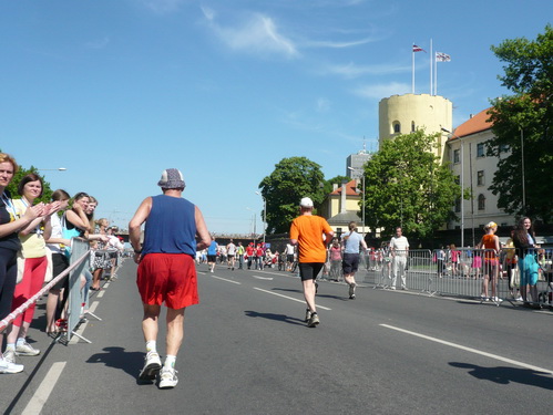 Links sehen wir die Nationaloper, dann geht es mit Musik und Tanz und vielen Zuschauern rechts durch schattige Altstadtgassen vorbei an dem noblen Shopping Center und vielen Kneipen zum bereits beschriebenen Rathausplatz mit dem Schwabe- und Schwarzhäupterhaus und dann hinunter zur Uferstraße. Ich traue meinen Augen nicht. So viele Zuschauer hätte ich nie und nimmer erwartet. Die Stimmung ist super. Cheerleader weisen den Weg in die nächste Runde oder ins Ziel. Gut 14 km sind geschafft.
