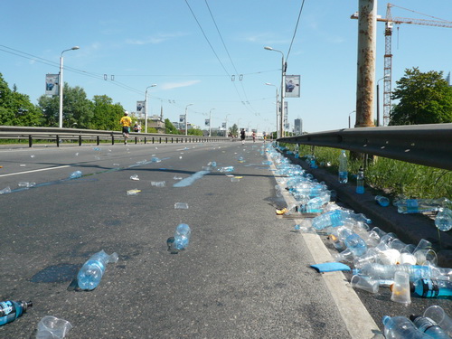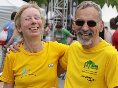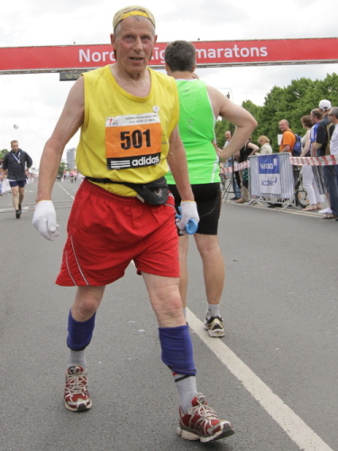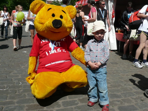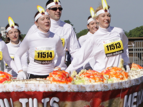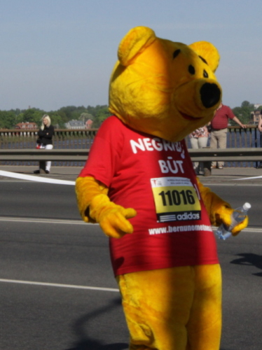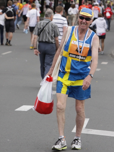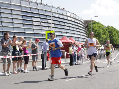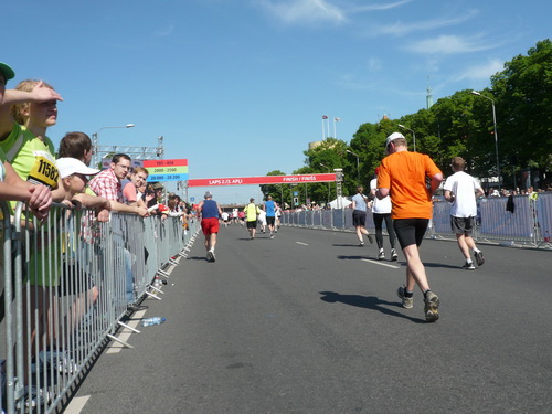 Statt zur dritten Runde laufe ich auf der rechten Bahn durch’s Ziel, lasse mich etwas verlegen beklatschen und genieße den Verpflegungsbereich, den ich so reich bestückt selten vorfinde. Bergeweise werden liebevoll gerichtete Käse- und Schinkenbrote angeboten und kartonweise von Läufern und Passanten davongetragen. Mit schlimmen Befürchtungen denke ich an die Marathonis, die nach 4:30 einlaufen und nach der vollen Marathondistanz vielleicht leer ausgehen. Denn eine Stunde halten die Vorräte dem Ansturm nicht mehr stand.