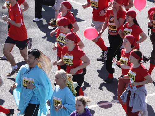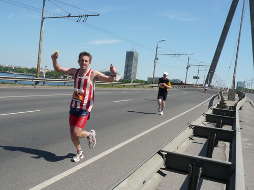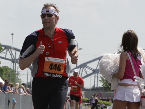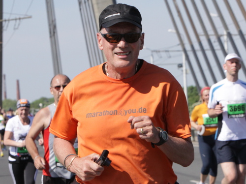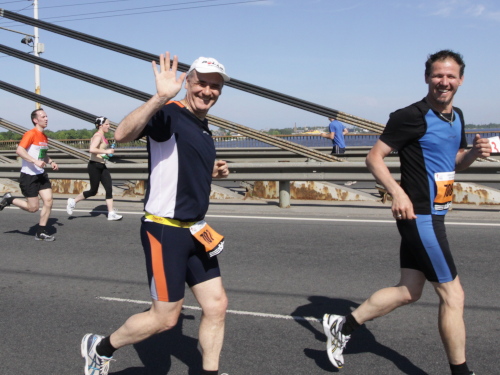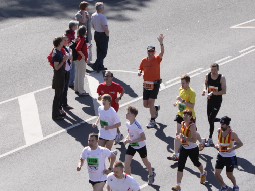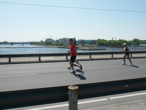 An der Verpflegungsstelle draußen beim Einkaufszentrum greife ich bei Wasser, Iso und Bananen kräftig zu, flirte ein wenig mit den beiden Mädels, die noch fit sind und bestimmt den ganzen Marathon durchhalten, und laufe gemütlich mein Tempo. Manche Läuferin und manchen Läufer kann ich überholen, während die ganz Schnellen mich bereits zum zweiten Mal passieren. Auf der Brücke ist es mit dem Gegenverkehr und den vielen Sehenswürdigkeiten auch noch ganz unterhaltsam. Trotzdem überlege ich mir, den Marathon nach zwei Runden und damit 28 km zu beenden und mein Knie, das ja nur Dank Spritzen überhaupt noch zum Laufen taugt, zu schonen. So schnell bin ich selten von einer Idee von mir begeistert. Lächelnd und locker setze ich meinen Lauf fort, wissend, diesen Teil meiner Aufgabe bald erledigt zu haben, um dann mit schwerem Fotogerät den einen oder anderen Eindruck noch intensiver einfangen zu können.