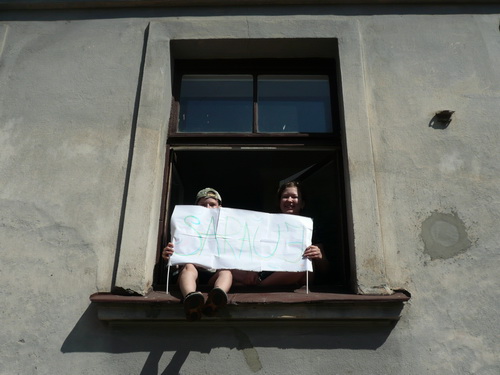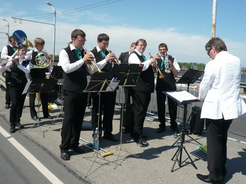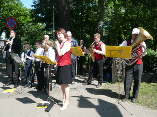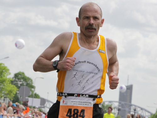 Gleich nach der Brücke wird es dann schlagartig ruhig, denn auch die „Halben“ verabschieden sich hier auf ihre verkürzte zweite Runde. Zwei Runden haben die Marathonis noch vor sich. Ich fürchte, das wird nicht jedem gefallen, dem einen oder anderen wird es auch zu warm und dann kommt auch gleich das rustikale Pflaster. Wenn auf diese Art eins zum anderen kommt, hört man auch schon mal einen Fluch. Da kommen die Musikkapelle und die Zuschauer, die sich um sie geschart haben, gerade recht. Gut gelaunt laufe ich weiter und denke bei den herrlichen alten Fabrikgebäuden daran, dass man weit weniger schöne Objekte bei uns mittlerweile auch zu Wohnanlagen umgestaltet und teuer verkauft. Vielleicht ist das auch hier einmal eine Option.