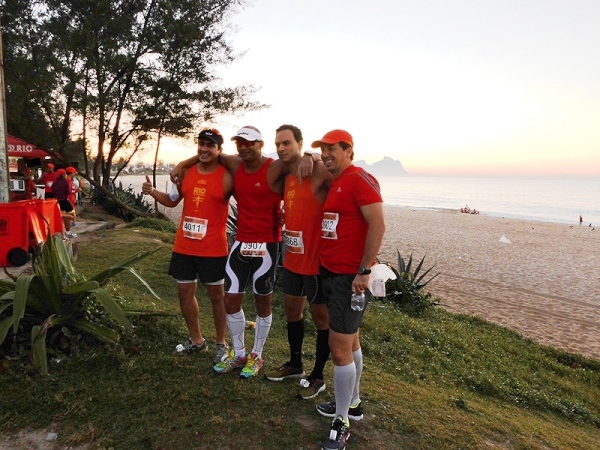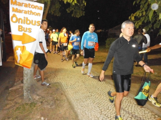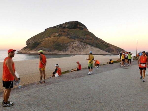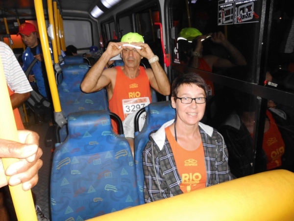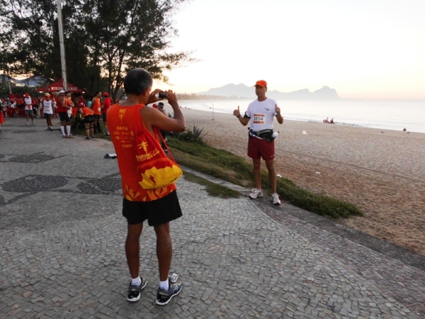 Die Busse mit dem orangenen Schild fuhren zum Marathonstart, die mit dem grünen zum Halbmarathon. Vor jedem Bus ein Einweiser mit Leuchtstab, der verhinderte das zu erwartende Chaos. Jeder Läufer bekam einen Sitzplatz. Das gibt es nicht mal am Rennsteig! Nach der Ausgabe für die Startunterlagen auch hier ein großes Lob für die Veranstalter. Die Busse fuhren übrigens zwischen 5 Uhr und 5.40 Uhr ab, wir hatten einen der ersten erwischt. Und das hatte sich gelohnt. Nach etwa 45 Minuten stiegen wir in Recreio aus dem Bus, direkt am Start, keine 50 Meter vom Strand entfernt. Und dort erlebten wir einen Sonnenaufgang, für den allein sich die Reise nach Brasilien gelohnt hätte. Ein drittes Lob an die Veranstalter – für die Wahl dieses Startortes …