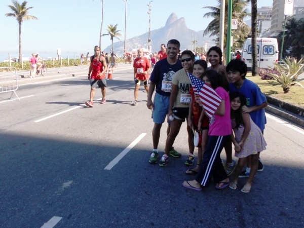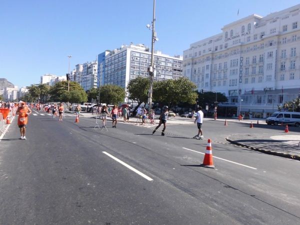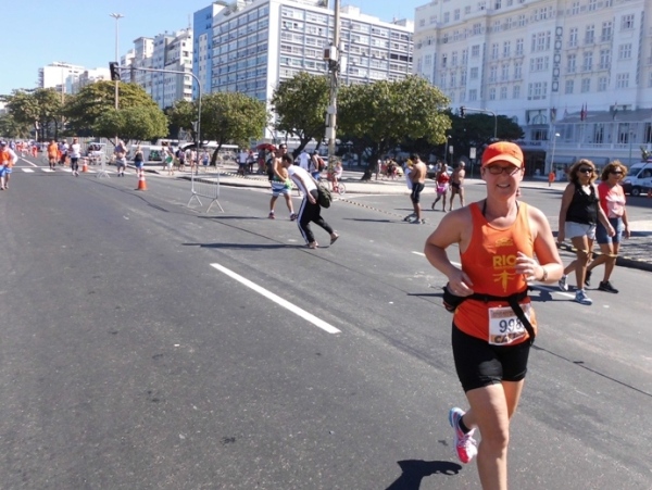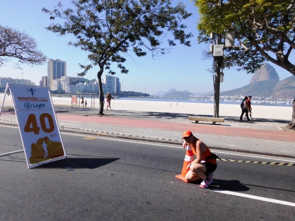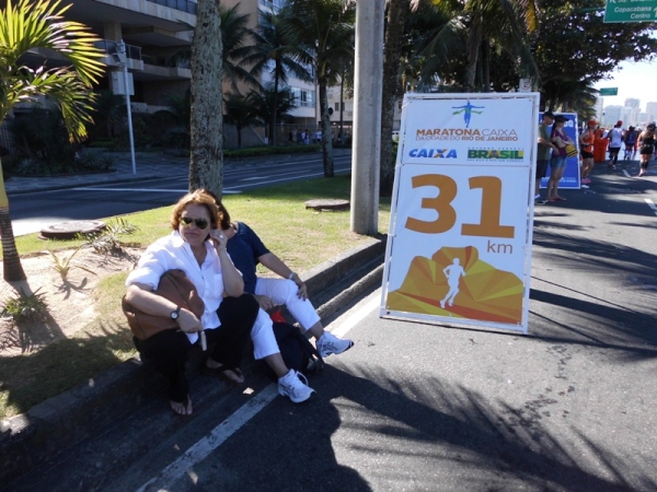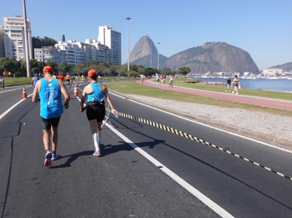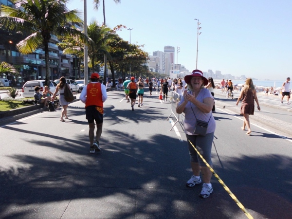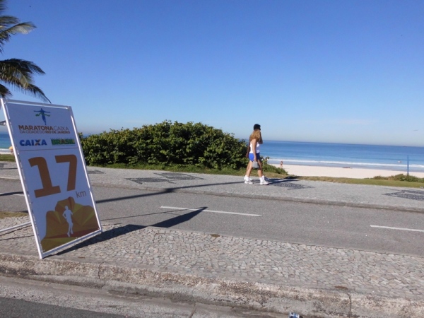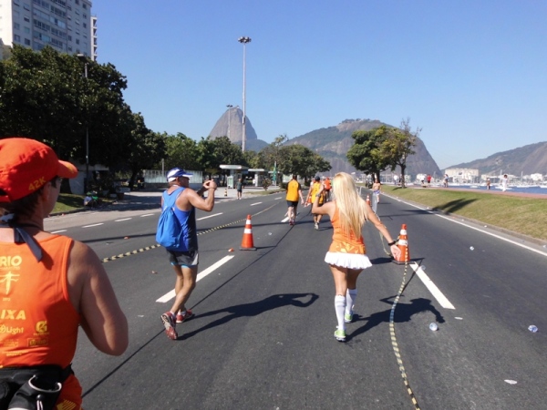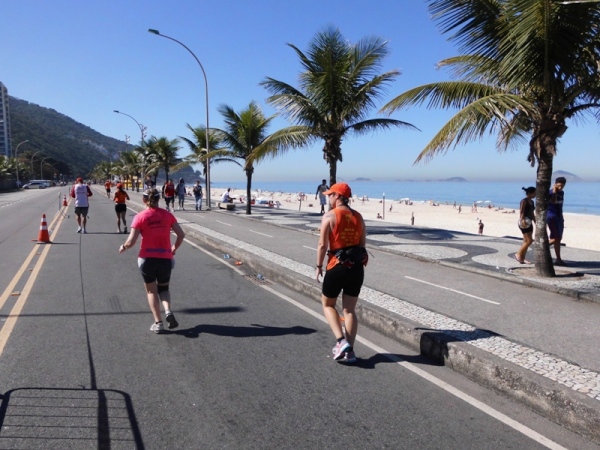 Wie fast die ganze Strecke wehte auch hier entlang des Strandes von Ipanema eine leicht erfrischende Brise. Was nicht darüber hinwegtäuschen konnte, dass die Temperaturmesser an den Werbetafeln 28 Grad anzeigten. Ging ja noch, um die Ecke herum, an der Copacabana zeigten sie 32. Und dort gab es keine erfrischende Brise mehr. Aber dafür etwas zu beißen, die erste feste Nahrung nach so etwa 35 Kilometern. Das war gut gemeint, das war richtig, aber den Riegel gab es ausgerechnet zwischen zwei Getränkestellen. Und der war vielleicht trocken! Nun hatte ich keinen Hunger mehr, aber wir mussten gehen. Grund: ausgetrockneter Mund. „Verfluchte Copacabana“, schimpfte Yvette. Leidend – am schönsten Stadtstrand der Welt.
