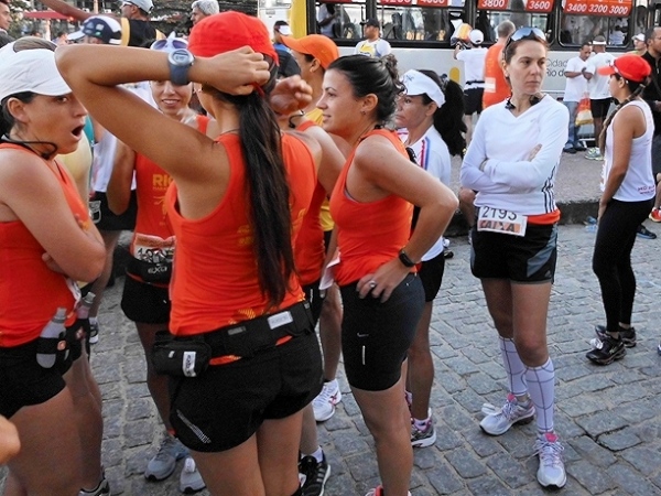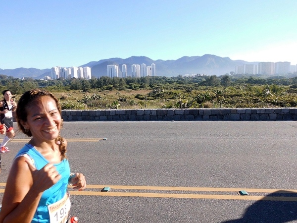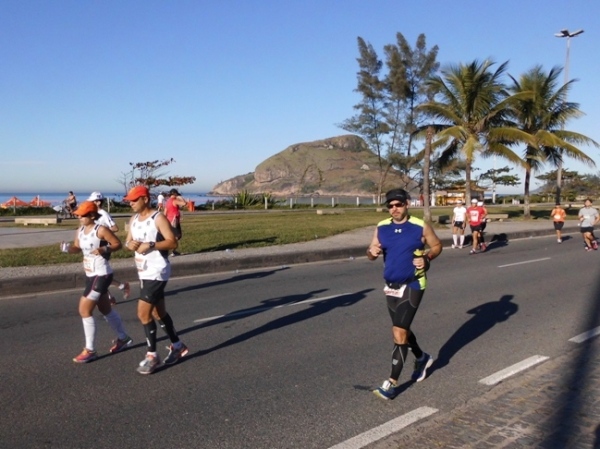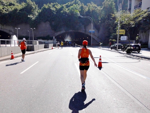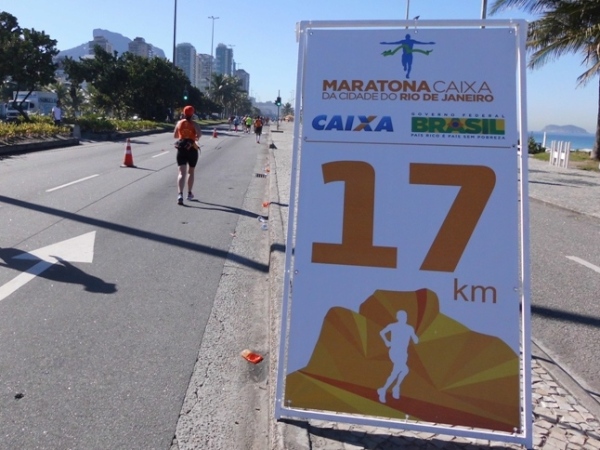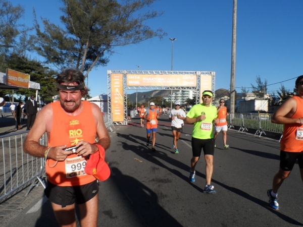 Zuerst liefen wir weg vom Zielort Rio, um nach einer Schleife von etwa 3 Kilometer wieder den Start zu passieren. Konnte das nicht das Ziel sein? Mir lief der Schweiß in Strömen, dabei hatten wir vielleicht gerade mal 20 Grad. Wir waren wohl etwas zu schnell. Ich trenne mich von meiner Mütze, aber nur um sie die nächsten 39 Kilometer in der Hand zu halten. Eine Mütze vom Rio-Marathon wirft man doch nicht weg…
