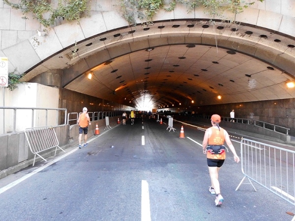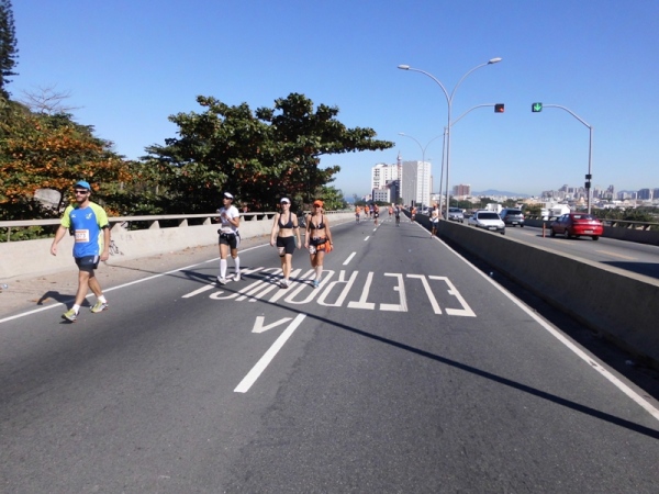 Zwischen Kilometer 22 und 30 änderte sich dann auch noch das Streckenprofil. Es ging eine langgezogene Steigung hinauf, die in einem Tunnel endete und dem ein längeres Stück unter einer Hochstraße folgte. Das bedeutete Schatten, erstmals richtigen Schatten. Den sollte man nutzen, im Tunnel schalteten wir einen Gang höher. Unter der Hochstraße nahm ich aber dann mehrfach den Gang raus. Was waren das für Ausblicke, auf das vor und unter uns liegende Sao Conrado? Das musste ich fotografieren! Was Yvette wohl etwas nervte und zu der berechtigten Frage verleitete: „Was machst du hier eigentlich, Marathon laufen oder fotografieren?“