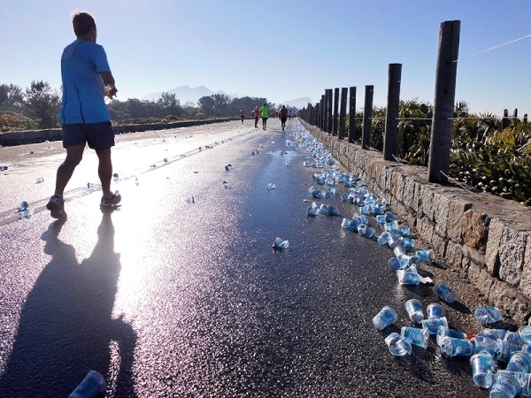Langsam bekam ich Hunger. Etwa bei Kilometer 8 musste es eine Verpflegungsstelle geben. Bildete ich mir ein. Leider gab es aber nur Wasser und Gatorade. Ja, gab es. Als wir vorbei kamen gab es nur noch einen Berg leerer Kartons und entlang der Straße den Müll derer, die schneller waren als wir. „Wenn das bis zum Ziel so weitergeht, bin ich verdurstet“, stöhnte Yvette. Und ich verhungert!