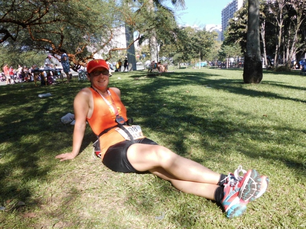 Noch einige Fotos vor dem Copacabana-Palace, dem legendären Grand-Hotel mit noch legendärer Gästeliste, dann noch durch einen Tunnel, Botafogo war erreicht. Das Ziel war nah, aber wir wurden wieder wie im Takt überholt. Weil ich doch fotografieren musste. Yvette vor dem Zuckerhut. Damit konnte sie noch leben. Aber andere Läufer vor dem Zuckerhut? „Alles wegen deinem blöden Bericht für Marathon4you!“ schimpfte sie und drohte, allein weiter zu laufen. Das ging natürlich nicht, so gaben wir beide nochmal Gas und überquerten nach fünfeinhalb Stunden gemeinsam den Zielstrich.