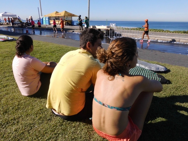 Seit wir den Start auf den Rückweg passiert hatten, führte die dreispurige Straße geradeaus. Rechts Strand und Meer, links im Hintergrund eine Bergkette, viel Grün und eine Lagune, dazwischen Hochhäuser. „Etwas eintönig“, sagte ich zu Yvette. „Ja, eintönig schön“, antwortete sie. Eintönig schön? Ja, klingt etwas blöd, aber treffender konnte man diese Gegend nicht bezeichnen.