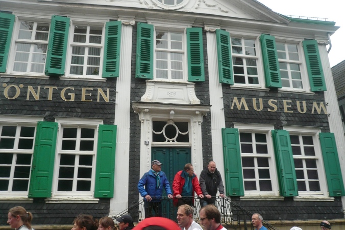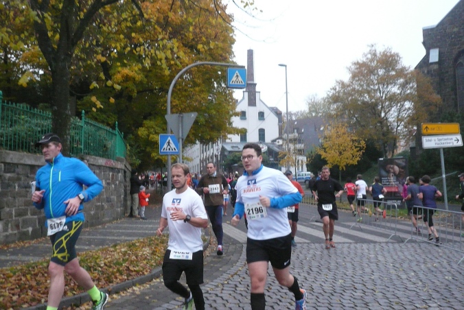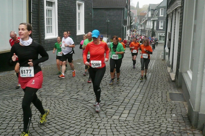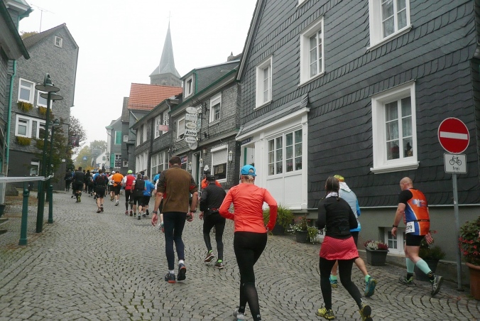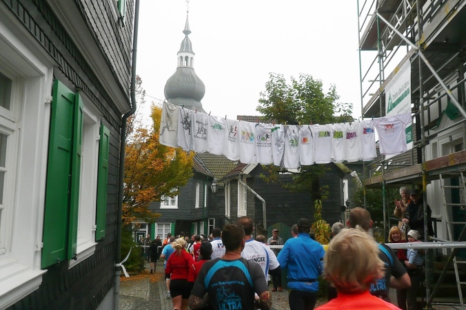 Wir laufen im Zickzack durch Hackenberg und dann abwärts in den alten Ortskern von Lennep. Direkt am Röntgen Museum biegen wir ab und laufen eine Schleife über die granitgepflasterten Straßen und Gassen. Über eine Gasse ist eine Leine mit diversen Röntgenlauf-Shirts gespannt. Hier sind wir richtig und auch herzlich willkommen.