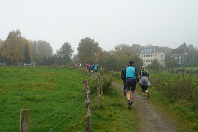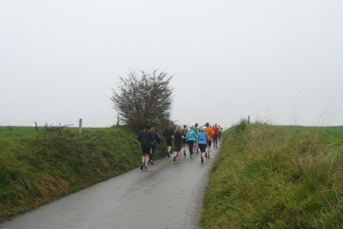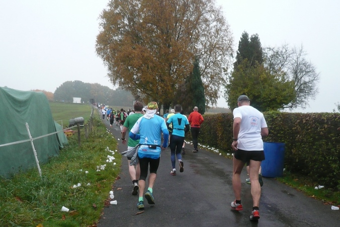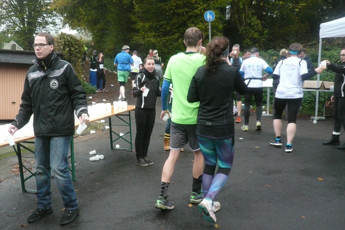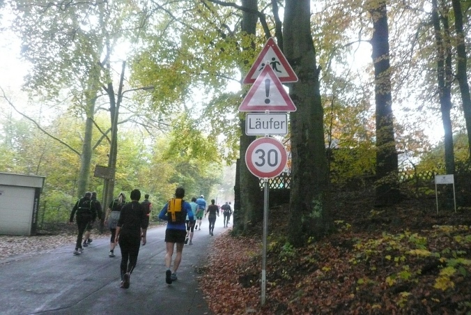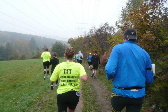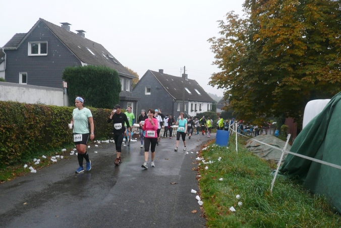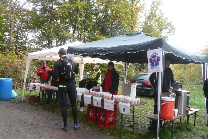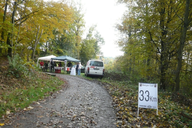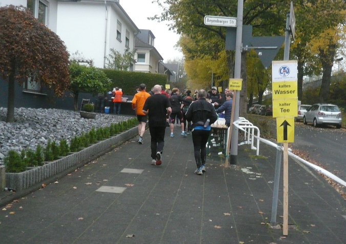 Es geht zurück nach Hackenberg, durch eine kleine Wohnsiedlung verlassen wir dann den Ort. Am Ortsende stehen auf einem Balkon Anwohner und rufen und trommeln uns lautstark zu, wie jedes Jahr. Kurz davor haben wir schon die ersten 5km geschafft. Jetzt geht es raus in die trübe Landschaft und ein längeres Stück abwärts in den Wald. Zu einer kleinen Ansiedlung geht es wieder bergauf und der erste Versorgungspunkt ist erreicht.