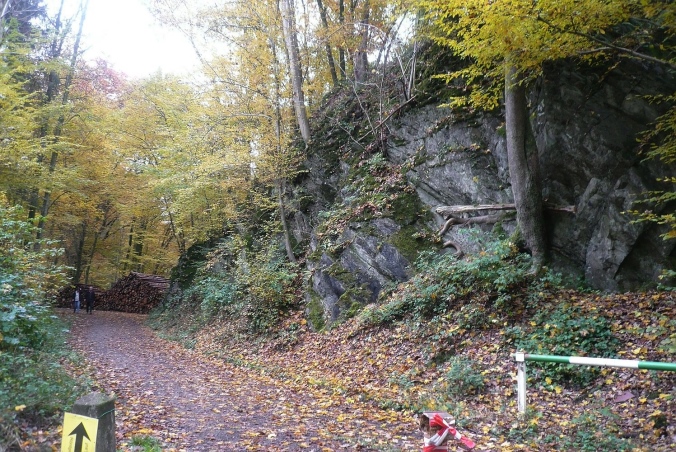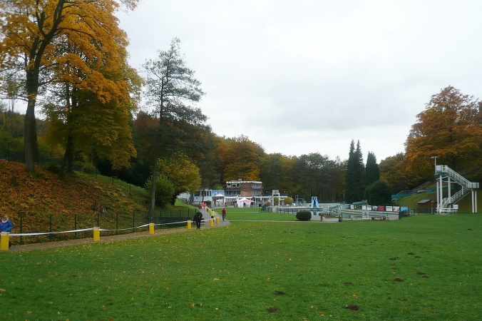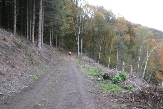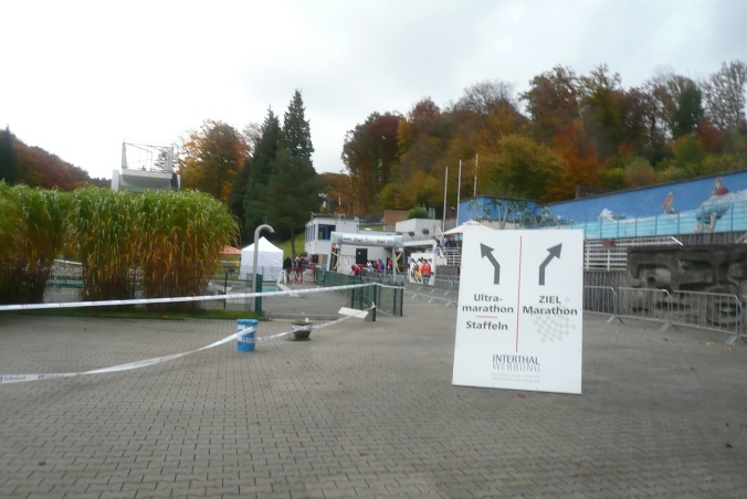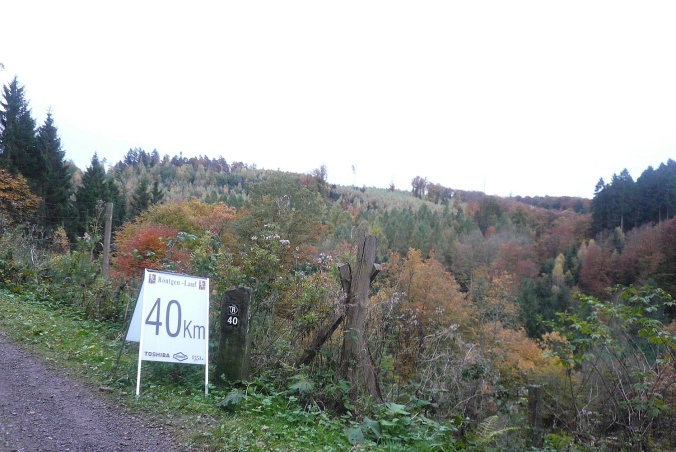 Wir folgen ein längeres Stück einem Bach mit vielen Feuchtbiotopen. Zwischen Felsen geht es weiter leicht aufwärts bis Km 40, wo wir einen herrlichen Blick auf den herbstlichen Wald genießen. Der Weg ist auch auf den letzten Kilometern wellig, vom Ziel ist lange nichts zu sehen. Zuerst hören wir den Sprecher und erst im letzten Moment sehen wir den Sprungturm vom Schwimmbad Eschbachtal. Jetzt nur nicht falsch laufen: Marathonis rechts, Ultras und Staffeln links vorbei. Geschafft.