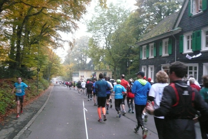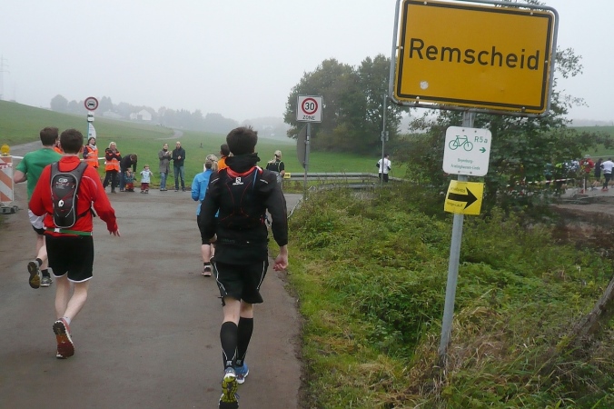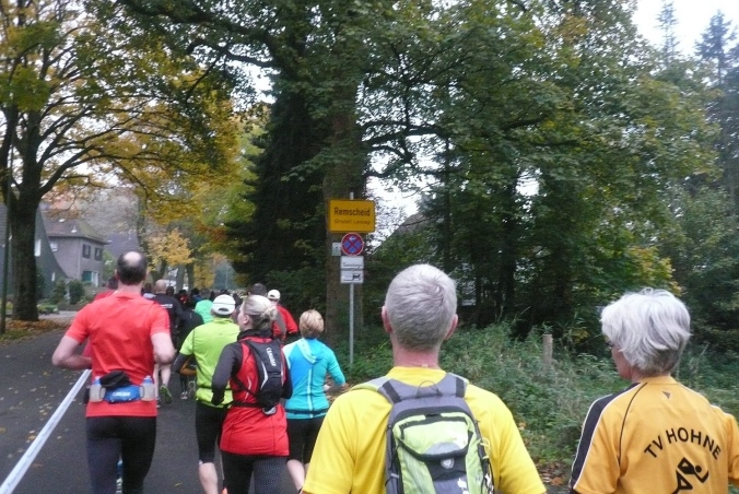 Über freie Felder erreichen wir Lüttringhausen, den nördlichsten Stadtteil von Remscheid. Es geht ein kurzes Stück durch den Ort, zu seiner Versorgungsstelle und dann wieder in den Wald. Nach einer weiteren Abwärtsstrecke überqueren wir den Leyerbach und werden auf der Asphaltstraße von einer Trommlergruppe empfangen. Bei Km 15 kommt bereits die nächste Verpflegungsstelle. Stärkung ist jetzt angebracht, denn es folgt ein längerer Anstieg. Auf einem Hohlweg geht es aufwärts und dann weiter am Waldrand entlang. Das nächste Gefällstück lässt nicht lange auf sich warten.