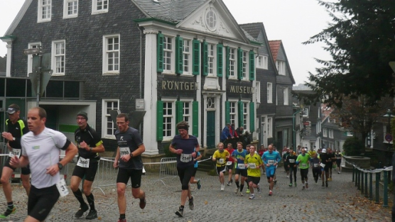 Im Ort ist die typische bergische Bautradition zu sehen, schwarzes Ständerwerk mit weißen Fernstern und Türen sowie gekalkten Gefachen und grünen Fensterläden. Ganz typisch ist das beim Deutschen-Röntgen-Museum zu sehen, an dem wir vorbei laufen. Der Namensgeber dieser Veranstaltung, der Physiker Wilhelm-Conrad Röntgen erhielt bekanntlich für die Entdeckung der Röntgenstrahlen als erster 1901 den Nobelpreis für Physik. Er veröffentliche viele wissenschaftliche Arbeiten, aber die Entdeckung der X-Strahlen hat bis in die heutige Zeit die medizinische Diagnostik revolutioniert. Im Röntgen Museum werden auf 2100 m² Fläche eine große Sammlung von persönlichen Dingen von Wilhelm-Conrad Röntgen sowie eine Zeitreise von der Entdeckung der X-Strahlen bis in die heutige Zeit gezeigt.