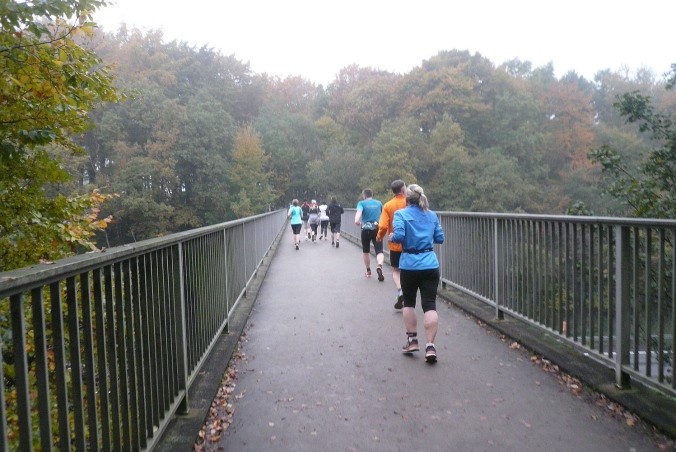 Ich bin genau unter der Brücke, als ein Zug darüber fährt. Ich höre ihn, sehen kann ich ihn nicht. Schade, wäre ich ein wenig schneller (oder langsamer) gewesen, wäre mir das seltene Schauspiel nicht entgangen.