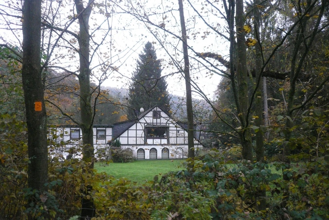 Es gibt einen Erlebnisweg durch bzw. um den Ort, auf dem wir zum Kaufmannshaus kommen, dem Verwaltungssitz einer ehemaligen Maschinenmesser-Fabrik. Hinter den letzten Häusern verläuft der sogenannte „Leichenweg“ zum Friedhof nach Cronenberg. Der Weg ist ziemlich holprig und man sagt, wer auf dieser „Teststrecke“ in seinem Sarg nicht aufwacht, ist wirklich tot und kann begraben werden. Kurz danach sind wir an den Resten der ehemaligen Fabrik. Auf einem Schild ist zu lesen: „Die Fabrik ist älter als unsere ganze Geschichte“. Vorbei am letzten Sensenschmied geht es durch den typischen Bergisch-Land- Ort mit seinen verschieferten Fachwerkhäusern.