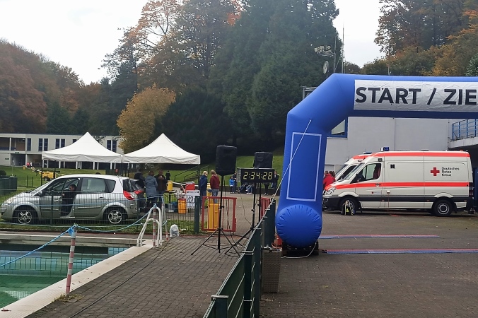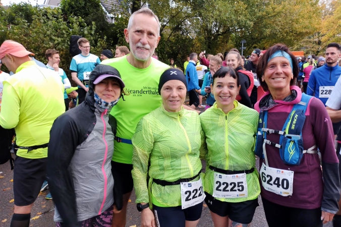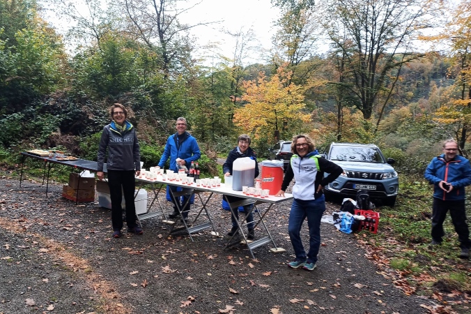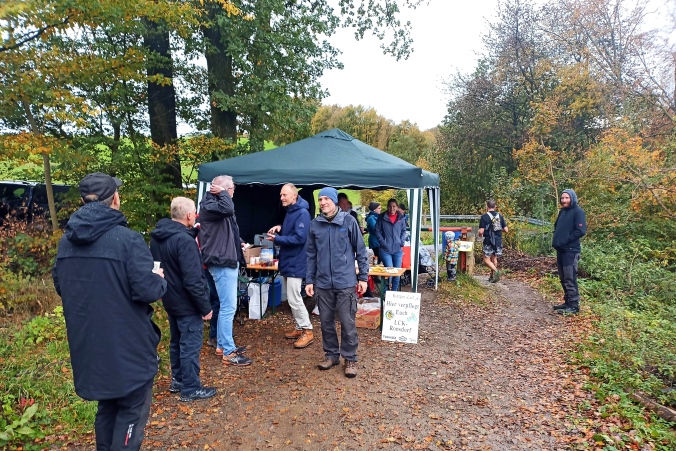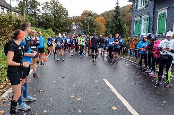 Pünktlich um 8:45 rollt der Bus an und setzt uns am Clemenshammer ab. Da ist alles, von Erfrischungen bis zum Dixi. Nur kein Regendach… Aber die Himmelsschleusen halten dicht. Am Start um 9:30 ist ein übersichtliches Feld, 114 Läuferinnen und Läufer werden schließlich im Ziel gezählt und gewertet.