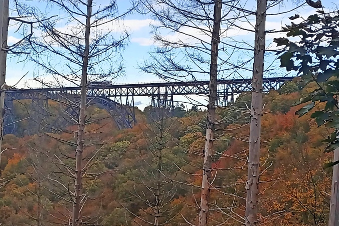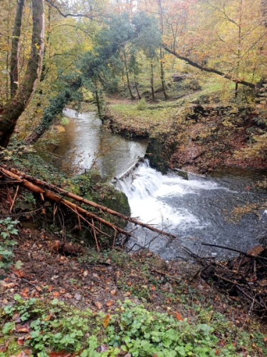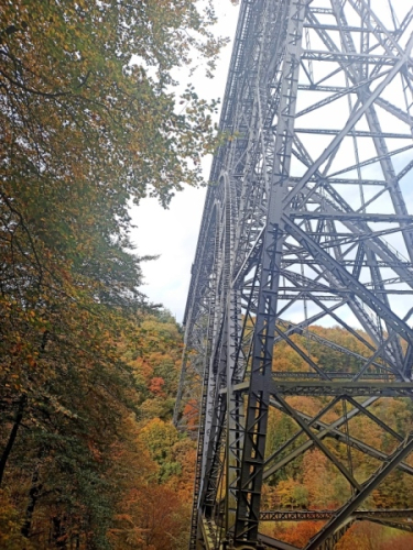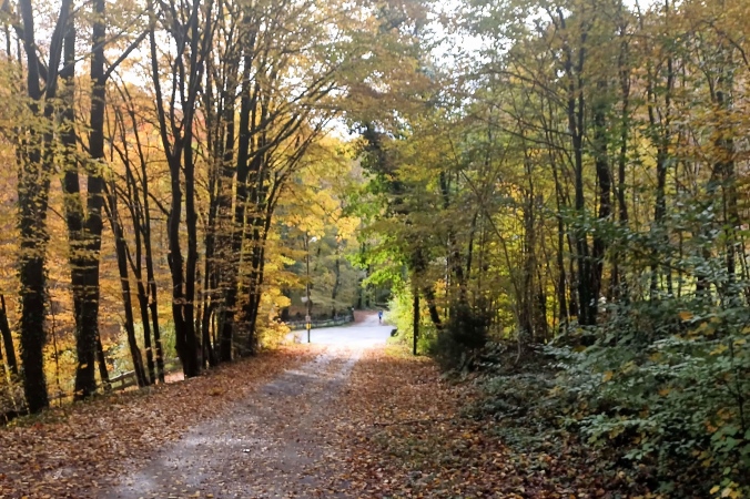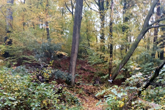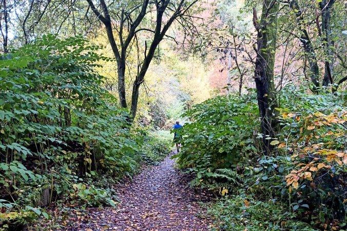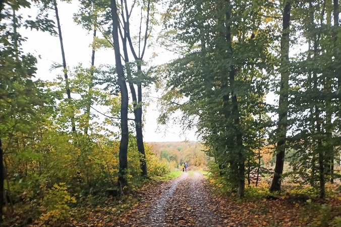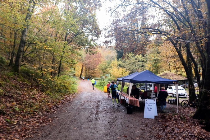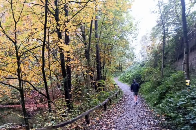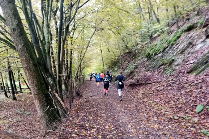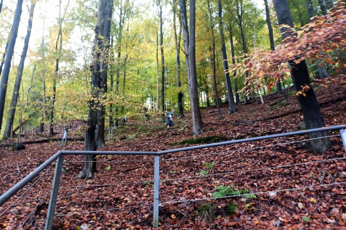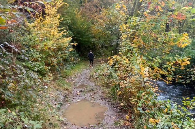 Ich schwebe auch weiter, aber langsamer. Ich will ja genießen. Der Herbstwald ist einfach zu schön, manchmal kommen sogar Sonnenstrahlen durch! Das hört im Eschbachtal auf, es zieht sich zu. Am Bach längs, in Richtung der Talsperre. Kurz davor liegt das Freibad, wo die Zwischenzeit genommen wird. An der großen Verpflegungsstelle kann, wer erschöpft ist, aussteigen. Ein Bus holt die Kameraden ab. Letzte Chance, denn jetzt kommt es dicke. Auf den letzten 21 km erwarten uns die meisten Höhenmeterchen. Beim Marathon immerhin 940, beim Ultra 1300. So etwa.