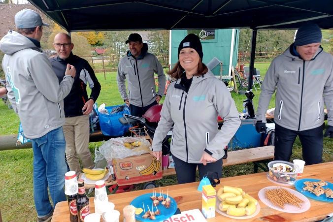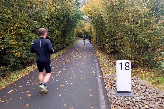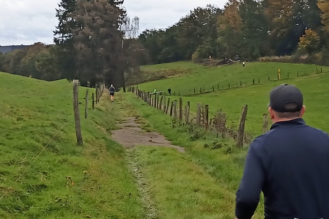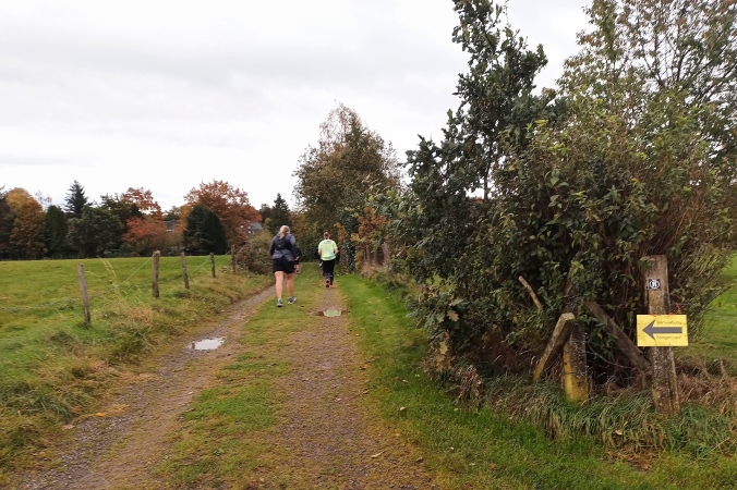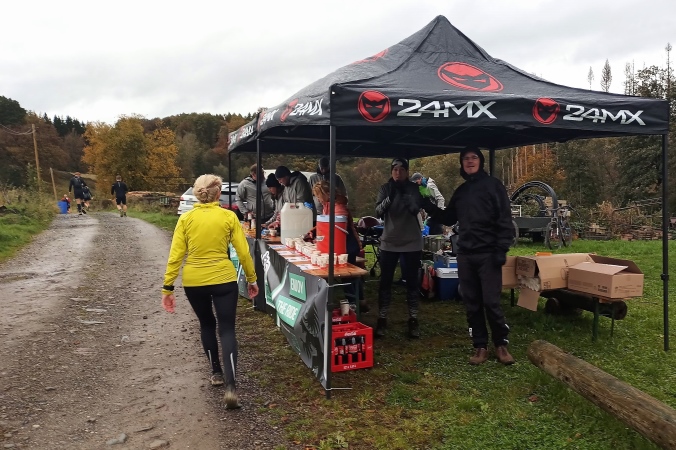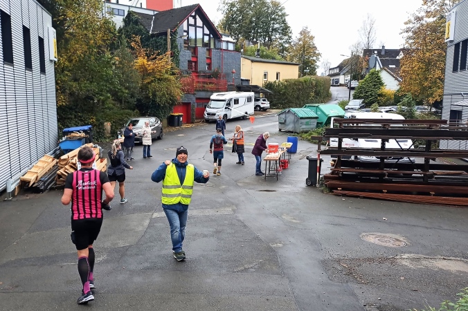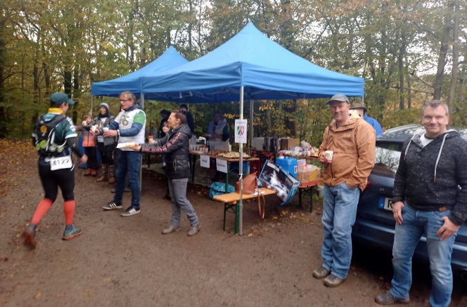 Auf einer alten Bahntrasse kommt ein entspannter Kilometer, dann gibt es wieder Gras und Matsch auf den Trails. Einfach schön, auch wenn ab und zu ein paar Regentropfen fallen. Irgendwann links ab, einer Straße entlang dem Dörpebach folgen. Ganz schön hügelig hier, dafür mit Abort direkt am Weg. Beim nächsten VP werden traditionell Bratwürste serviert, das wissen aber nur Insider. Mit Kölsch kann man sie runterspülen und die letzten 10 km in Angriff nehmen. Es folgt unmittelbar der zweithöchste Aufstieg, die Stärkung ist also nicht umsonst.