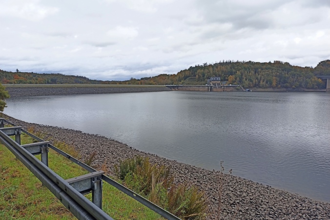 Schnell hoch und auch wieder runter, rechts ab zur Wuppertalsperre, dort am Ufer weiter nach Norden. Es regnet nun deutlich stärker, aber unter den Bäumen geht es einigermaßen. Die Regenhaut bleibt, wo sie ist. Kaum 5 km noch und es kommt nochmals ein Aufstieg; so einer von der lästigen Sorte. Endlos. Nervtötend. Als es bergab geht, findet man den letzten VP.