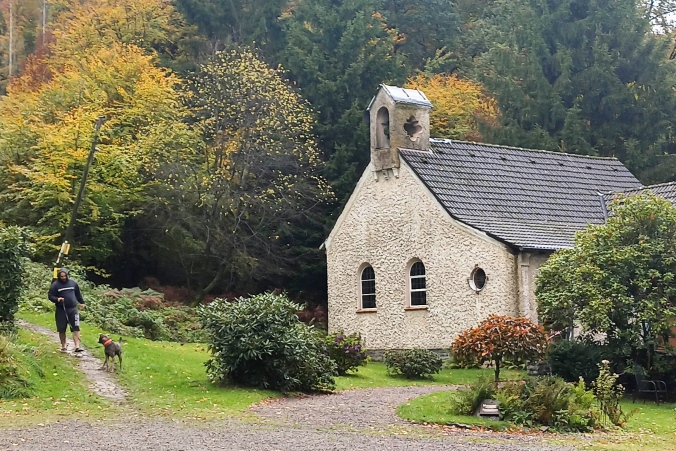 Dann über eine Brücke, rechts ab und auf schmalen Trail einem Nebenbecken entlang und auf die Staumauer zu. Die Waldkirche ist unser Ziel. Von links kommen Läufer von kürzeren Strecken, die dürfen auf der Straße bleiben, wir bleiben auf dem Trail. Richtig schön, nicht zu steil, der Boden weich. Oben dann Felder, erste Häuser und bergab der Zieleinlauf!