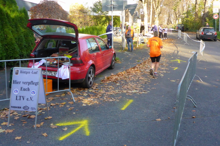 Auf breiten und abgesperrten Straßen zieht sich das Feld auseinander, es ist genügend Platz vorhanden, das Überholmanöver leicht stattfinden können. Es geht auf der Anhöhe flach Richtung Stadt und die ersten Hot Spots der Zuschauer mit Tröten, Töpfen und Fahnen feuern uns an. Frank nutzt meine Fotopausen und holt auf, zuletzt waren wir uns beim Bilstein begegnet. Leicht bergab, noch vor Erreichen des zweiten Kilometers, kommt die Spitze schon von der Altstadtrunde zurück gerast. Wir kommen an historischen Villen und Gebäuden vorbei, wie jedes Jahr hängt die Sammlung von Röntgenlauf-Shirts an einer Leine über der Strecke.