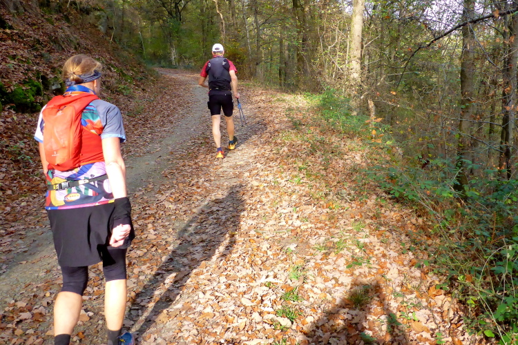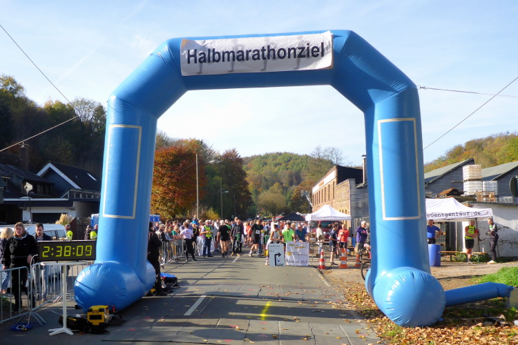 Oben ein paar Meter gerade über Teer, dann geht’s auf der anderen Seite genauso steil wieder bergab nach Heusiepen. Jetzt folgt mein Lieblingsstück: auf 2 km geht es vorbei am Zillertal um etwa 80 HM runter und schon ist das Halbmarathon Ziel erreicht. Die Wege sind durch Laub bedeckt und man ist bei jedem Schritt gespannt, was wohl darunter liegt. Einige Stürze zeugen von bösen Überraschungen. Ich tobe mein kurzes Runners-High aus und genieße. Die meisten Läufer verlassen im linken Zielkanal die Strecke und holen sich ihre wohlverdiente Medaille für den Halben, wir biegen rechts ab und finden den nächsten VP vor. Clemenshammer ist erreicht, die Staffeln wechseln, ein Drittel ist geschafft.