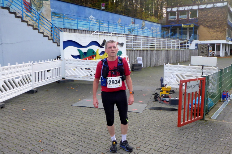 Meine Anreise beginnt am Vortag, ich habe noch einen freien Hotelplatz in Remscheid-Lennnep bekommen. In etwa 2km Entfernung vom Start im Sportzentrum Hackenberg erspare ich mir die frühe Anreise am Renn-Sonntag. Und mit der Zeitumstellung auf Winterzeit gibt es noch eine Stunde Schlaf dazu. Die Ausgabe der Startunterlagen findet in einer der Sporthallen auch schon am Vorabend statt, ebenso eine große Pasta Party und eine Marathon Messe. Mir laufen Marion und Jochen über den Weg, sie plündern noch die Schnäppchen und wollen dann schnell ins Bett, ihr Start für die 100 km ist schon um 2 Uhr. Die Ausgabe der Startunterlagen erfolgt zügig, es gibt zur Startnummer einen stabilen Kleiderbeutel und ein Starter-Shirt. Dank Champion-Chip wird die Netto-Zeit gemessen.