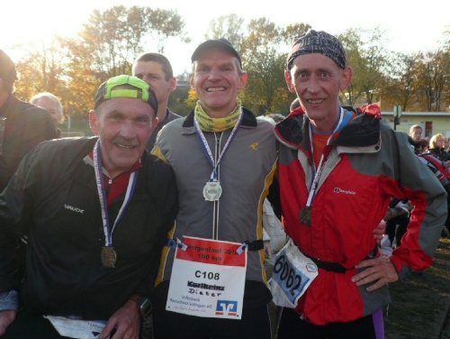 Ein Stückchen weiter sitzt Thomas Wille auf einer Bank. Der lässt sich erst nach meiner Androhung, das Bild ins www zu stellen, zum Aufstehen bewegen. Dann wird ein Bekannter überholt. Dieter Ehrenberger ist heute auf den 100 Kilometer unterwegs. „Jetzt ist es ein Leistungswandern geworden,“ erklärt er. Kein Wunder, liegen doch schon gut 90 Kilometer hinter ihm.