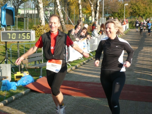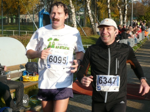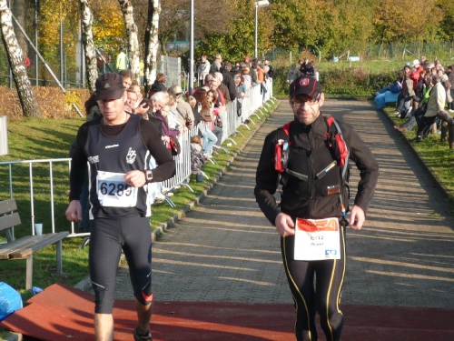 Auf der gegenüberliegenden Seite leuchten nun die Bäume mit ihrem bunten Herbstlaub im nun schönsten Sonnenlicht. Vereinzelt spreche ich 100-Kilometer-Läufer an. So komme ich an einen Mann aus Russland. In Englisch geht der Gedankenaustausch mit Kirill Tsvetkov ganz leidlich.