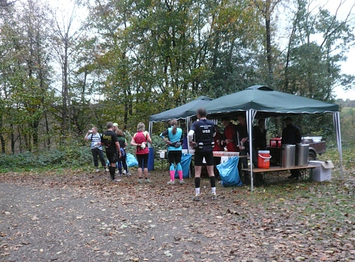 Gleich sind wir an der ersten Versorgungsstation mit Wasser und Obst. Über dem freien Feld weht ein starker Wind, begleitet von Nieselregen – eine unangenehme Mischung. Mit der Nässe werden auch die Wege schwierig und rutschig und Trailrunner sind in ihrem Element.