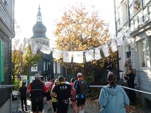 Wir erreichen den alten Stadtkern von Lennep. Direkt am Röntgen Museum biegen wir ab. Über granitgepflasterte Straßen und Gassen erreichen wir den ursprünglichen mittelalterlichen Kern. Über eine Gasse ist eine Leine mit vielen Finisher-Shirts von den letzten Röntgen-Läufen gespannt. Hier sind wir also herzlich willkommen.