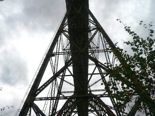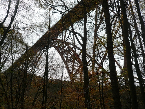 Hinter der nächsten Biegung ist der stählerne Koloss dann durch die Bäume auch zu sehen. Es ist die Müngstner Brücke (ehemals Kaiser-Wilhelm-Brücke). Es ist die höchste Eisenbahnbrücke Deutschlands mit einer Spannweite von 465m. Ende des 19. Jh. wurde die Brücke aus Stahl erbaut. Es wurden 5.000t Stahl und 950.000 Nieten verarbeitet. Zurzeit wird die Brücke noch bis 2015/2016 für rund 30 Millionen Euro saniert.