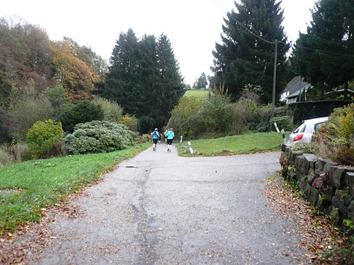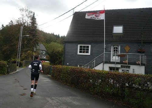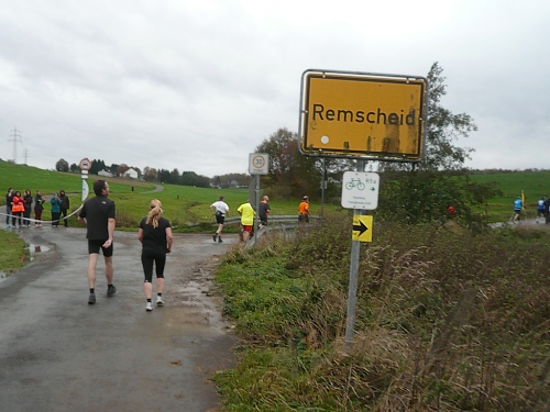 Noch bevor wir in den Stadtkern kommen, sind die schnellsten Halbmarathonis bereits wieder auf dem Weg aus der Stadt heraus. Die ersten 4 Kilometer sind ruck-zuck vorbei. Es geht zurück in Richtung Startplatz, um dann Hackenberg zu verlassen. Am Ortsende stehen auf einem Balkon Anwohner und rufen und trommeln uns lautstark zu. Jetzt geht es abwärts zum Wald und nach einer Schleife bei km 7 sofort wieder aufwärts. Wie schon gesagt: Bergisches Land ist gleich bergiges Land.
