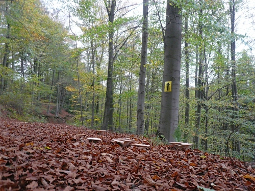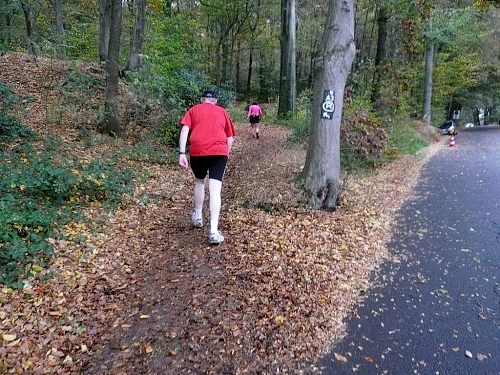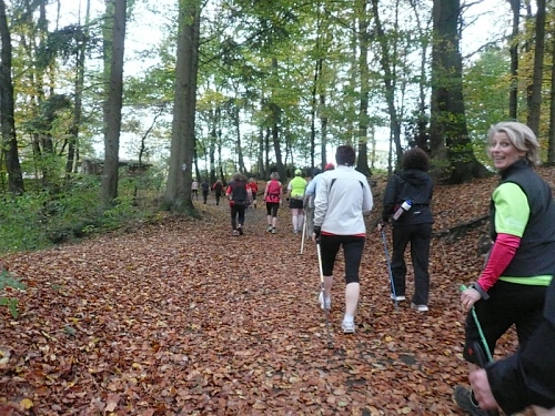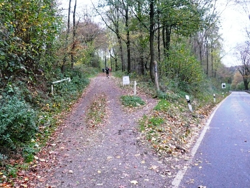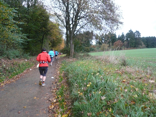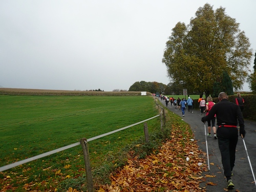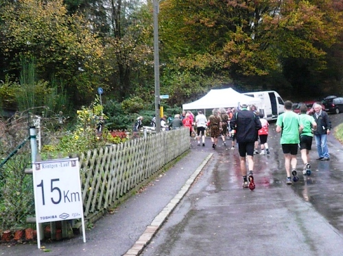 Das 15-Km Schild ist erreicht. Es folgt ein längerer Anstieg, vor dem wir uns aber an der Verpflegungsstelle stärken können. Zuerst geht es über eine Hohle Gasse aufwärts, dann am Waldrand aufwärts, dann durch den Wald aufwärts und schließlich durchs Feld aufwärts. Endlich sind wir oben und ich kann mich auf der sich anschließenden Abwärtspassage aus der Nordic-Walker-Gruppe verabschieden.