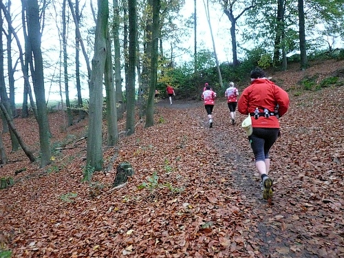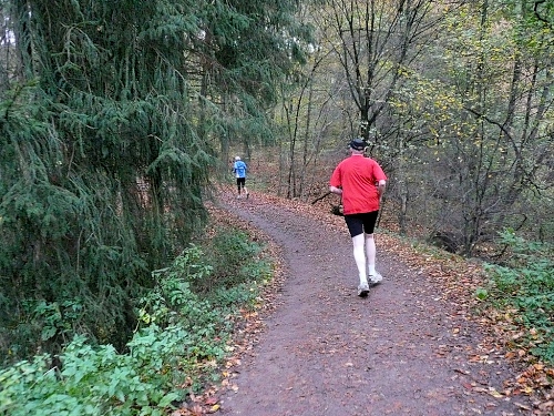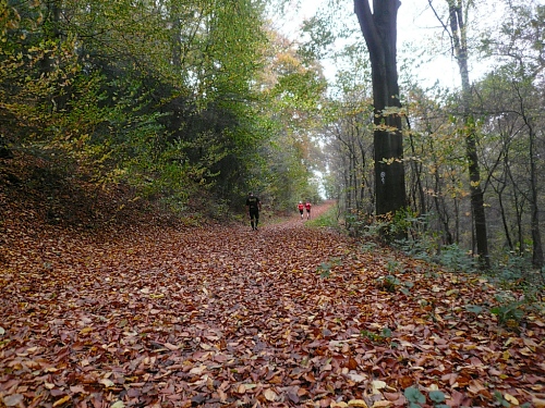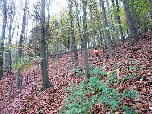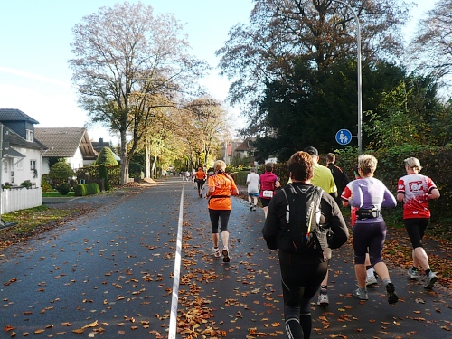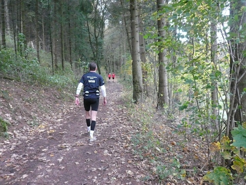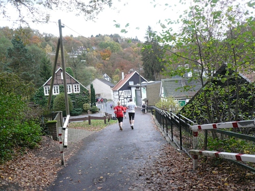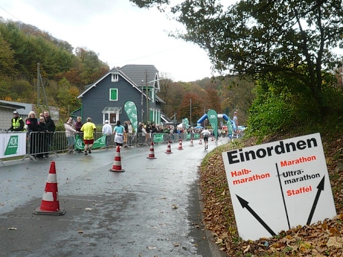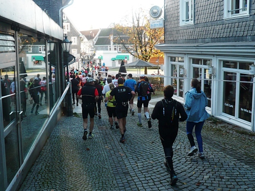 20 Kilometer sind gelaufen, wir sind noch immer im bunten Herbstwald. Erst kurz vor Hasten geht es steil abwärts in den Ort, wo die Halbmarathonis im Ziel sind. Für Marathon-, Ultra- und Staffelläufer geht es rechts weiter. Das Feld wird um ca. 1.000 Läufer und Nordic-Walker lichter.