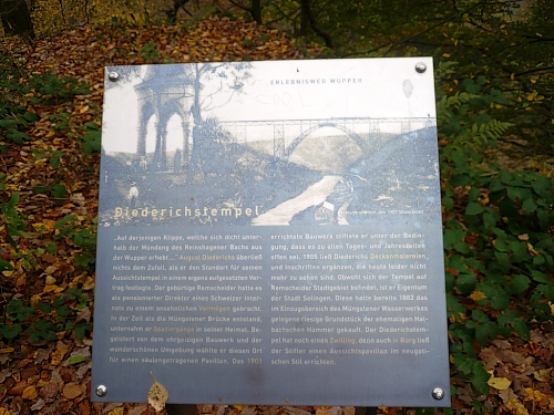 Bei km 29 im Wald gibt es eine weitere Versorgungsstation. Nur ein Stück weiter kommen wir am Diederichstempel Müngsten vorbei. August Diederich ließ sich hier oberhalb des Reinshagener Bachs auf einer Klippe Anfang des 20. Jh. einen Tempel im gotischen Stil erbauen. Er liegt leider nicht direkt an der Laufstrecke ist aber von dort zu sehen. Von dieser Klippe soll man einen herrlichen Fernblick ins Tal und auf die Große Stahlbrücke haben.