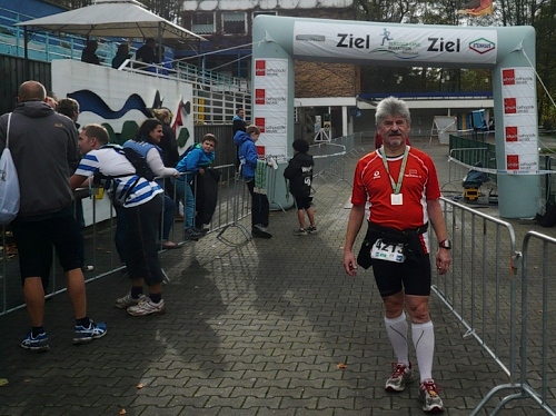 Nicht durchs Jammertal, durchs Hammertal geht es weiter. Wir kommen an verschiedenen ehemaligen Hammerwerken und Kotten vorbei. Wir folgen dem Bach und etlichen Feuchtbiotope bis zur nächsten Versorgung. Dann das 40km-Schild, dann „Noch 1 km“. Vom Ziel ist zunächst noch nichts zu sehen, nur zu hören. Der Sprungturm vom Schwimmbad Eschbachtal kommt als erstes ins Blickfeld. Jetzt nur noch runter zur Weiche. Achtung, für Marathonis rechts einordnen, Ultras und Staffeln links. Es ist geschafft. Durchs Ziel, sich die schöne Medaille um den Hals hängen lassen und noch schnell ein paar Fotos.