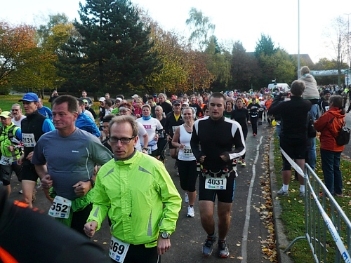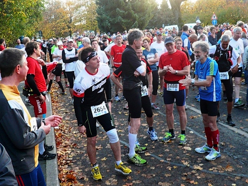 Etliche Bekannte sind am Start, die Marathonsammler sind halt eine große Familie. Die Wettervorhersage für heute ist 13 – 15 Grad Tageshöchsttemperaturen mit 70% Niederschlagsrisiko. Na, schaun mer mal.