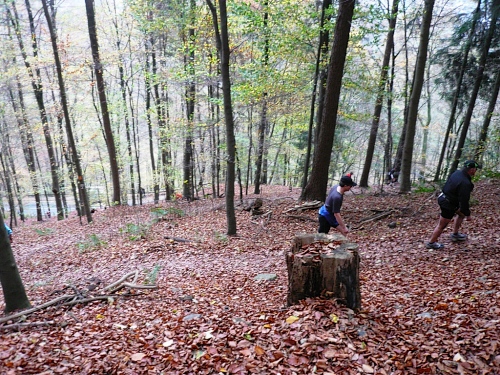Bei km 33 nochmal Versorgung. Wir umlaufen die Südspitze von Westhausen. Dann bei km 36 geht es steil runter. Oben werden wir auf einem großen Schild vor dem Gefälle gewarnt. Nicht umsonst, denn es ist nicht nur steil, sondern auch sehr rutschig. Geübte Trailer jubeln, Straßenläufer fluchen.
