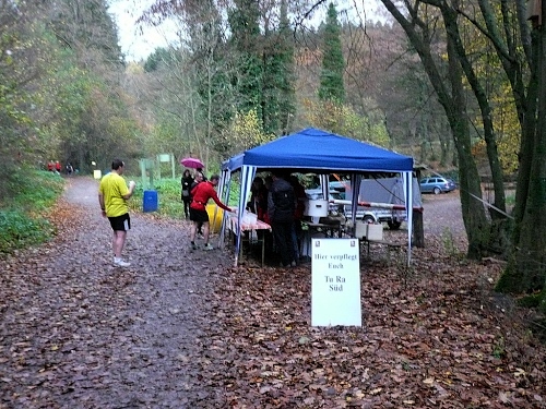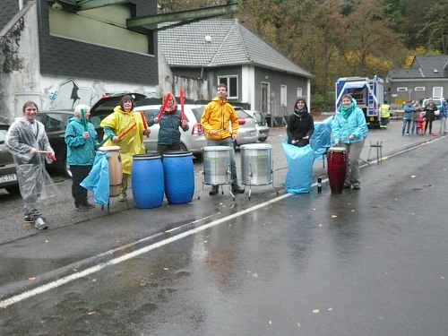 Unter einer Brücke finden etliche Zuschauer Schutz vor dem Regen. Kurz danach die nächste Versorgungsstation. Wir umlaufen den nördlichen Ortsrand und tauchen wieder in den herbstlichen Wald ein. Buntes Laub und matschige Wege prägen das Bild. Jetzt über den Leyerbach, dann sind wir auf einer Asphaltstraße und werden von einer Trommlergruppe im Regen empfangen.