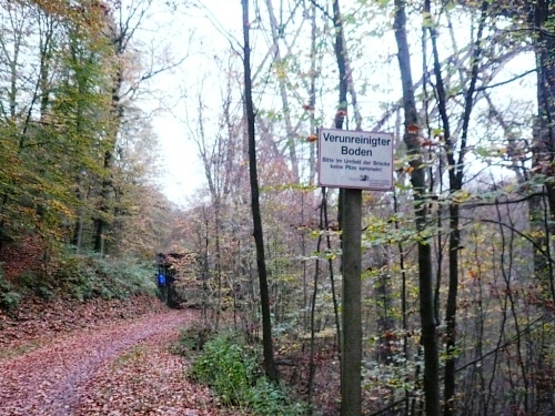 Kurz danach kommt km 30. Neben der Laufstrecke stehen jetzt viele Pilze, aber Vorsicht. Auf einem Schild, wird wegen der Verunreinigung des Bodens im Bereich der Brücke vor dem Pilzesammeln gewarnt. Ein Foto ist erlaubt, und weiter geht’s. Aufwärts, was denn sonst.