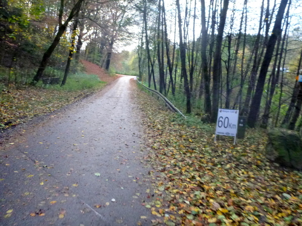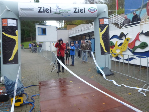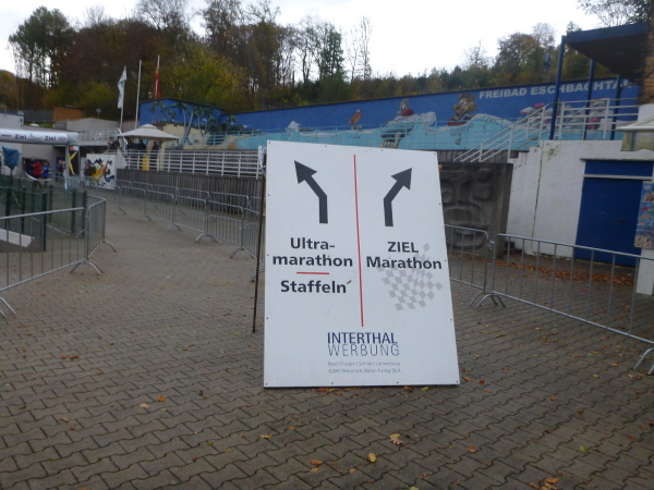 Die nächste VP kommt und es hat wieder aufgehört zu regnen. Es gibt erneut Müsliriegel und ich genehmige mir eine Cola. Der Weg führt am bewaldeten Eschbachtal entlang. Wir überqueren den Bach und müssen wieder bergauf. Laut meiner Uhr kann ich das Limit nicht mehr schaffen. Plötzlich taucht, früher als erwartet, das km 40 Schild auf. Trotz der Steigung nehme ich nochmal alle Kraft zusammen. Nur noch 1 km - das muss klappen. Ich höre schon den Sprecher und erreiche gleich das Freibad Eschbachtal in Großberghausen. Hier ist der Zielbogen des "Schein-Bergisch-Land-Marathon" (nach dem neuen Sponsor benannt) aufgebaut. Wieder richtig einordnen, der Moderator sagt mich an und muss lachen, weil ich schnell noch Fotos mache. 13 Uhr 55 - 5 Minuten vor cut-off! Er beglückwünscht mich und wünscht mir noch viel Spaß auf den letzten Kilometern.