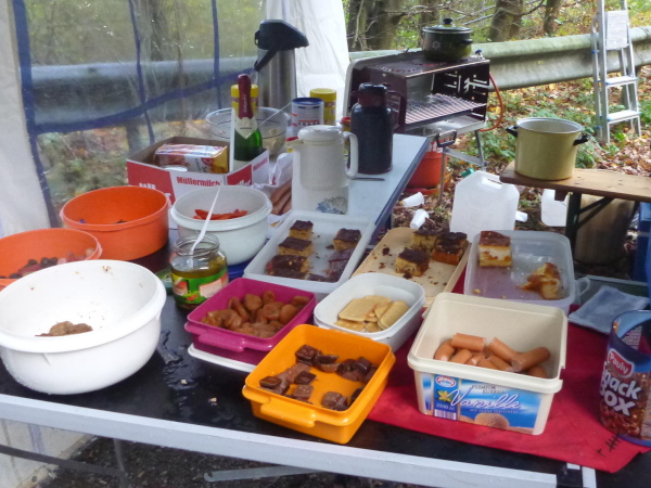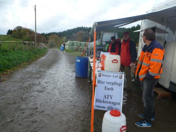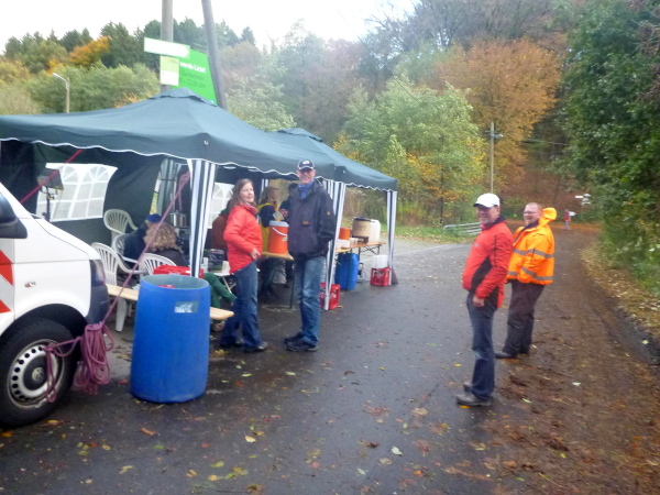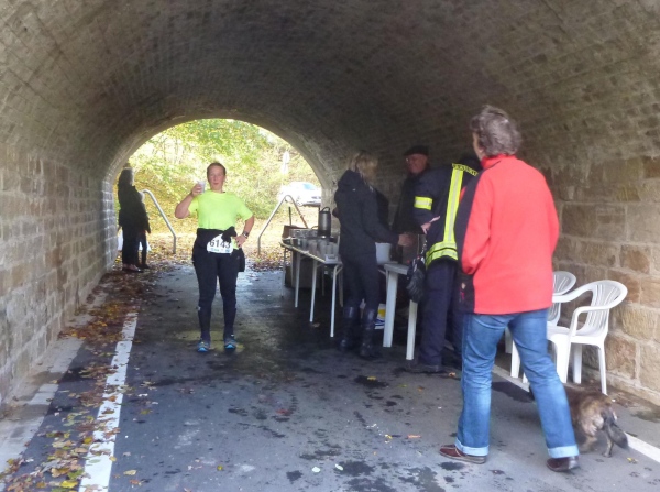 Unten verlassen wir den Wald und kommen auf eine übersichtliche Landstraße. Von weitem kann ich Manuela kämpfen sehen. Als ich vorbei laufe, klagt sie über Magenschmerzen. Oh je, das werden lange restliche 8 km für sie. Wir erreichen die nächste VP. Ein Helfer kommt heran und bietet mir Wasser und Brühe an. Brühe - lecker. Dann erkenne ich, dass ich im Paradies gelandet bin. Es gibt richtiges Essen! Außerdem ist die Truppe echt gut drauf. Ich werde als Schwäbin enttarnt und erfahre, dass einer von ihnen in der Nähe meines Heimatortes gearbeitet hat. Gerne würde ich noch bleiben und mir den Bauch voll schlagen. Aber ich muss weiter. Es geht bergauf. Oben angekommen, sieht man die Feldbachvorsperre, der erste Abschnitt der Wuppertalsperre. Ich weiß nun, dass es nicht mehr weit ist.