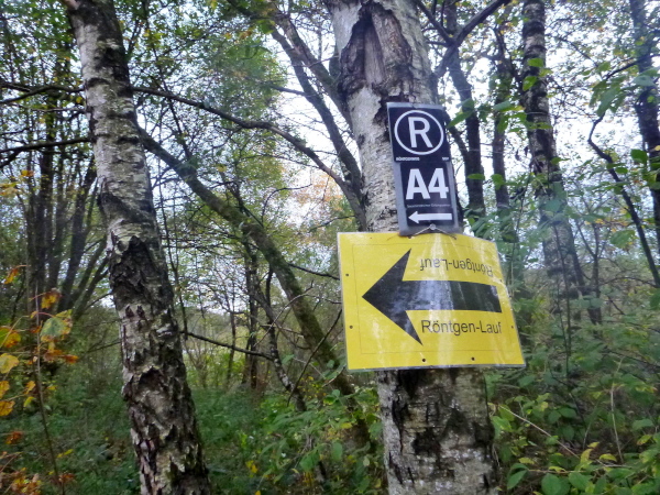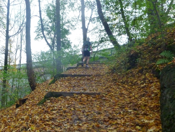 Gerne würde ich den kleinen Abstecher zum nahen Müngsterer Diedrichstempel machen. Aber der Cut-off drückt und ich fühle mich nicht mehr so fit. Eigentlich gibt es zwei solcher Pavillons; beide wurden von dem wohlhabenden August Diederichs Ende des 19. Jahrhunderts sowie Anfang des 20. Jahrhunderts gestiftet. Diederichs suchte sich den Platz für die Bauwerke selbst aus und verfügte, dass die Pavillons zu allen Tages- und Jahreszeiten für die Öffentlichkeit zugänglich sein sollten. Der eine, achteckige Pavillon im neuromanischen Stil, befindet sich bei Schloss Burg ein paar Kilometer weiter. Der Müngstener Pavillon ist hingegen in neugotischem Stil gebaut und hat eine siebeneckige Grundform. Die Aussicht von dort auf die Müngsterer Brücke soll grandios sein.