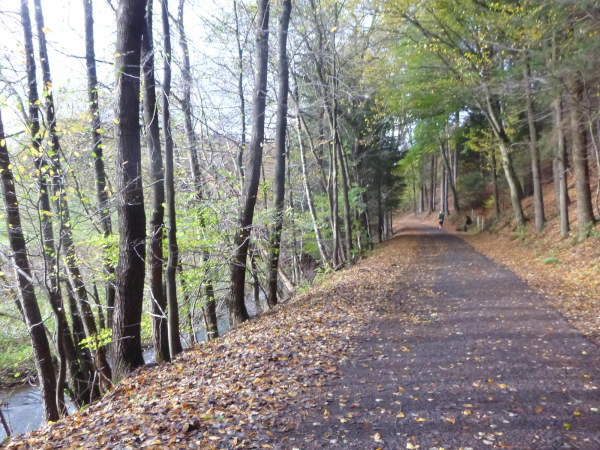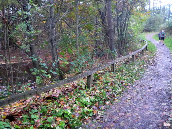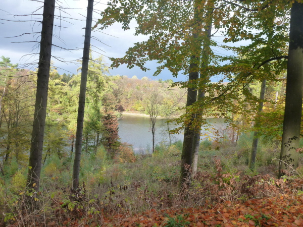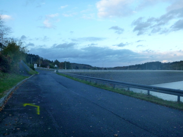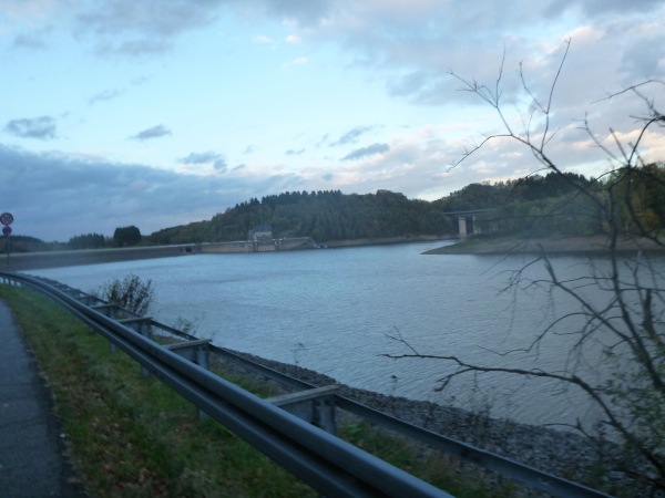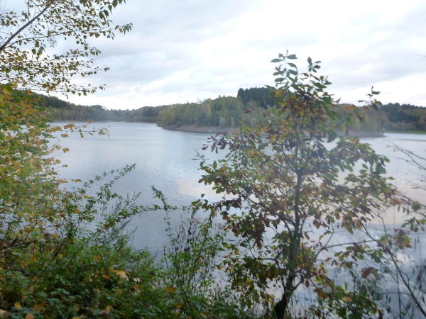 Ein Tunnel bringt uns unter der A1 hindurch. Über Treppen gelangen wir hinauf zur Staumauer der Eschenbachtalsperre. Der mühsame Aufstieg wird mit einem wunderbaren Blick über den Stausee belohnt. Die Herbstfärbung tut ihr übriges. Hier könnte ich bleiben und genießen. Und was soll ich sagen: Genau in diesem Moment kommt die Sonne heraus! Ein perfekter Augenblick.