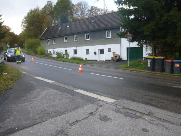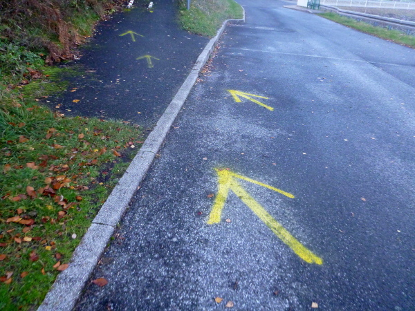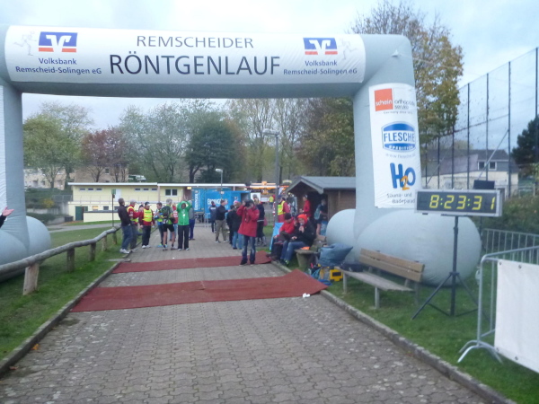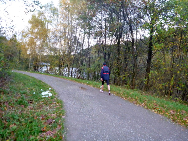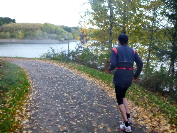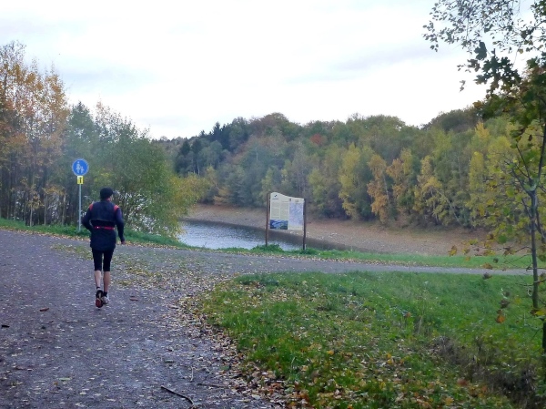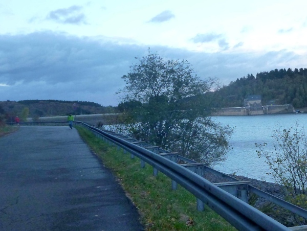 Erst auf dem Radweg, dann auf der Straße laufen wir an der Wuppertalsperre entlang. Einzelne Autos kommen entgegen und feuern mit einem Hupkonzert die wenigen Läufer an. Hier ist auch ein Teil der Strecke des 5 bzw. 10 km Laufs. Pfeile schicken uns links auf einen kleinen Radweg. Es geht nochmal steil bergauf. Renate kommt ein letztes Mal von hinten. Obwohl es oben wieder flacher wird, kann ich sie nicht mehr einholen. Auf der Anhöhe lässt eine Familie Drachen steigen. Der Wind bläst erneut steif von vorne. Die Sportanlagen sind aber schon in Sicht. Zwei Kurven später empfängt mich Norbert im Ziel.