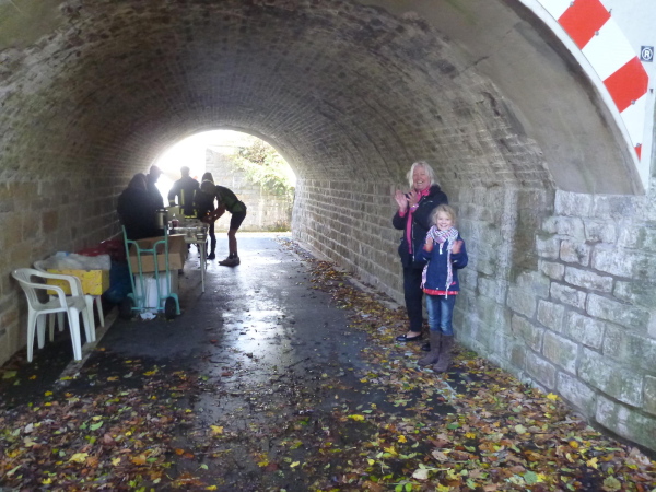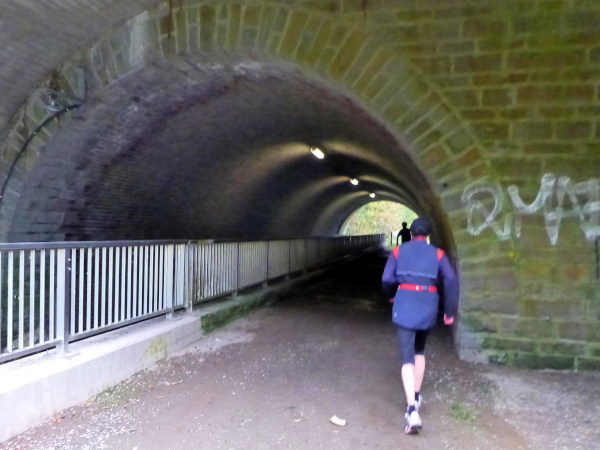 Nach km 45 lassen wir den See hinter uns. Es geht bergauf. Mal mehr, mal weniger steil, aber immer bergauf. Auf dem letzten Abschnitt verlassen wir den Wald. Am Sportgelände von Bergisch Born geht es unter der alten Bahntrasse hindurch. Im Tunnel liegt, regengeschützt, der nächste VP. Durch das sonntäglich verwaiste Industriegebiet geht es auf die Landstraße nach Bornbach. Über der Ortschaft thront majestätisch ein sich emsig drehendes Windrad. Die Sonne zwischen den fliegenden Wolken lässt mich hoffen, den Lauf trocken beenden zu können.