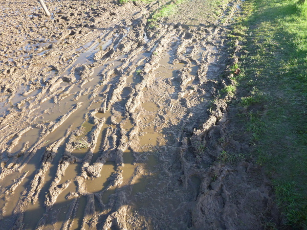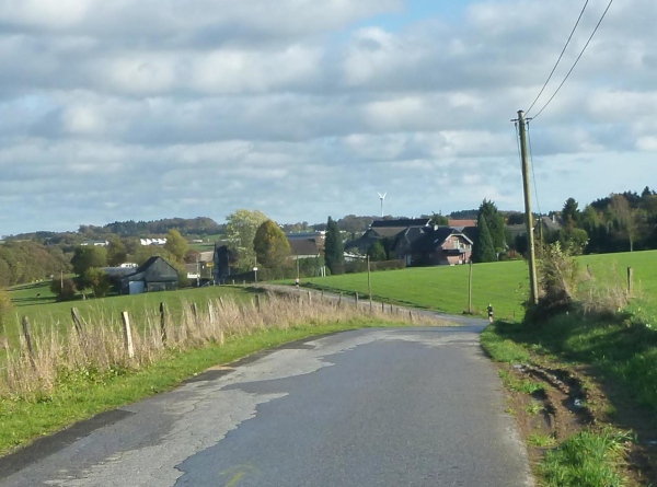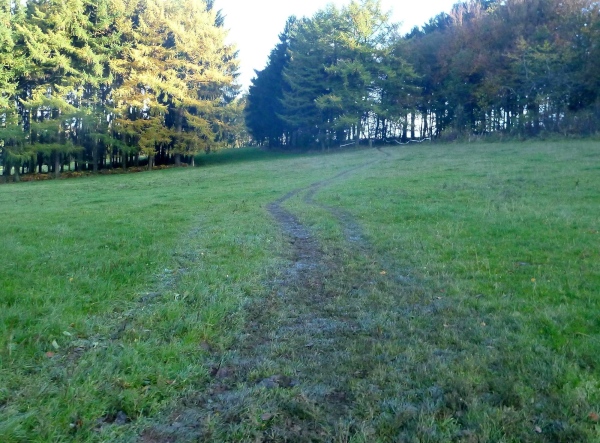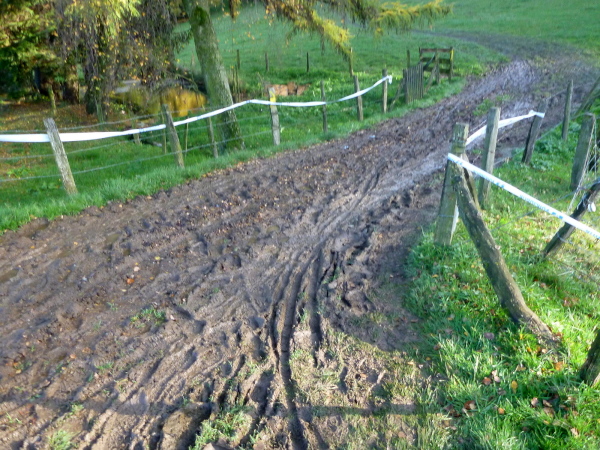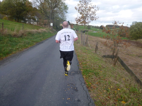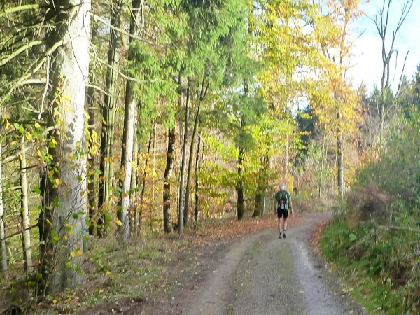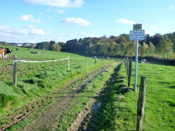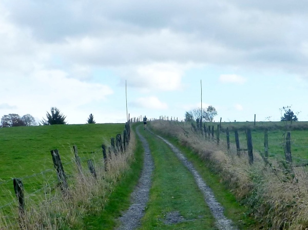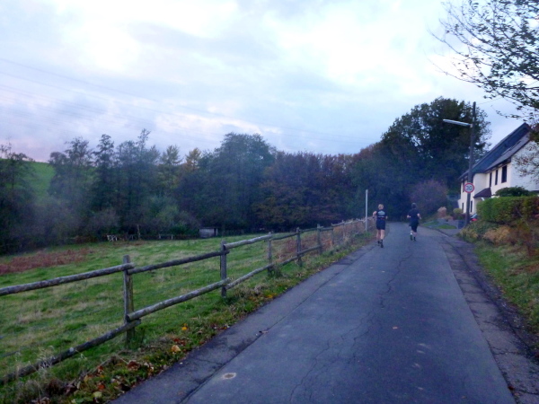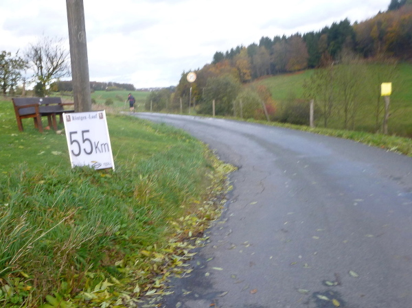 Der kleine Ort ist schnell durchquert. Gerade will ich auf den Feldweg einbiegen, da schrecke ich zurück: Überall Matsch! Ich hangle mich am Zaun entlang. Die Kühe ignorierend, laufe ich vorsichtig weiter. Hier ist der Weg immer noch ziemlich aufgeweicht. Der nächste Sumpf wartet bereits. Mist, bis jetzt hatte ich noch fast saubere Schuhe. Dann geht es quer über die Wiese hoch. Die Spur der Läufer vor mir ist eindeutig zu erkennen. Ein schmaler aber sauberer Trail nimmt uns auf. Kurz darauf geht es auf eine schmale Asphaltstraße Richtung "Sonnenschein" (der Weiler bei km 50 heißt wirklich so). Um die Straße zu vermeiden, schlagen wir einen Haken, berühren kurz Wiehagen und gelangen in einem spitzem Winkel wieder zurück. Ich laufe auf Renate auf. Als erfahrene Ultraläuferin ist sie in gleichmäßigem Tempo unterwegs. Da ich bergab immer ziemlich schnell bin, überhole ich. Bergauf revanchiert sie sich.